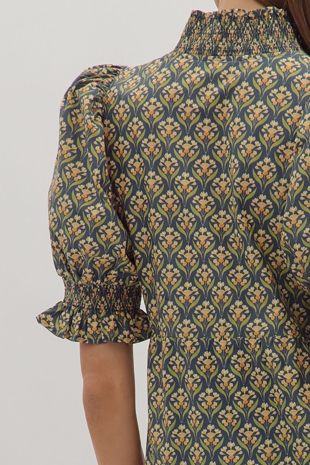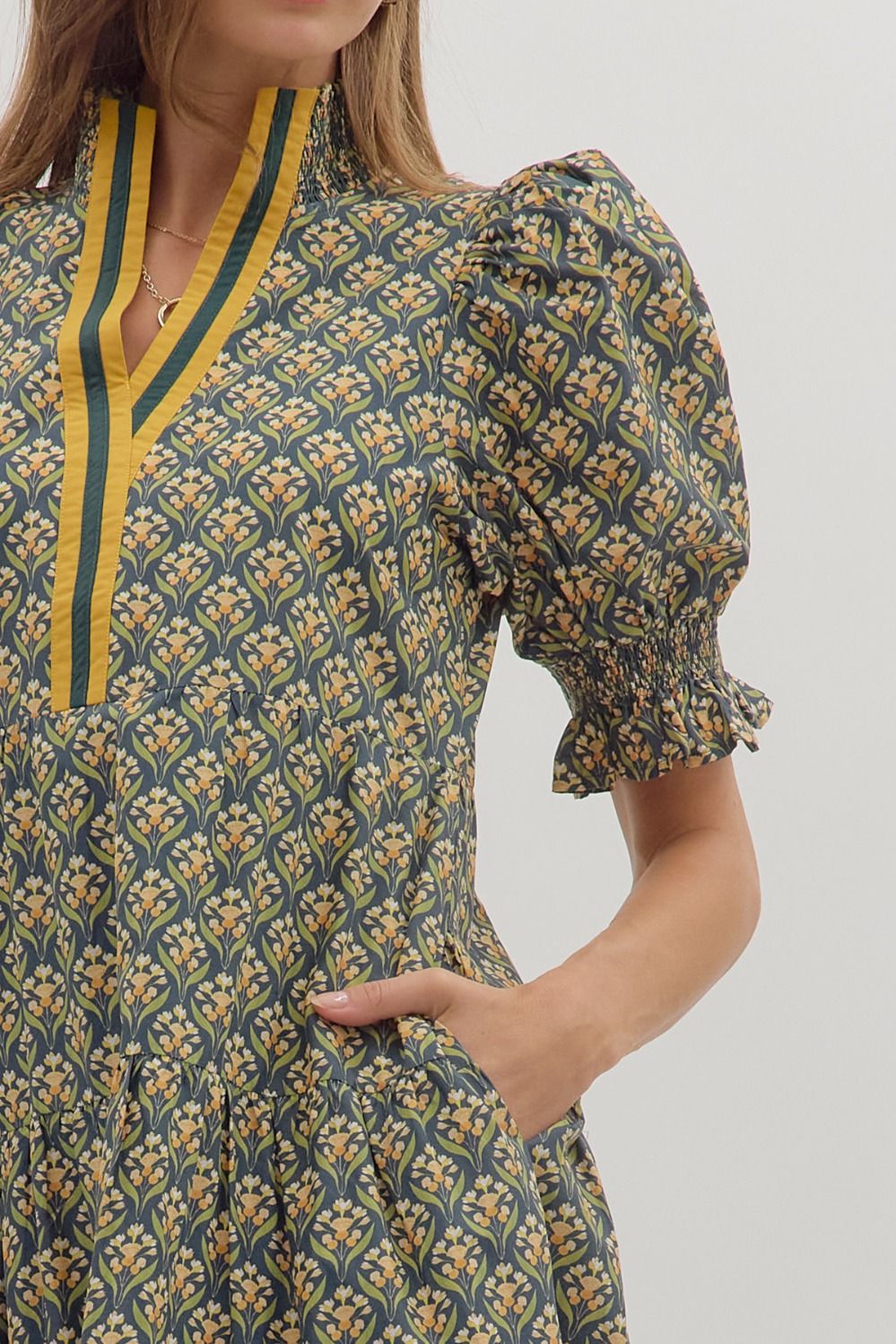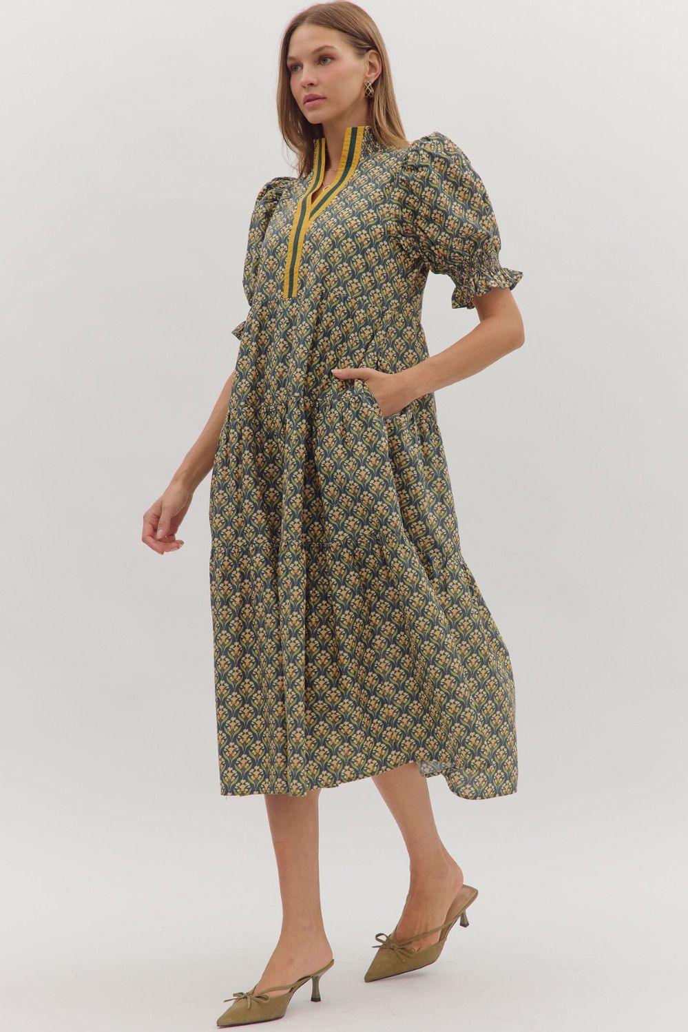 Botanical Print Puff Sleeve Dress- Hunter Green