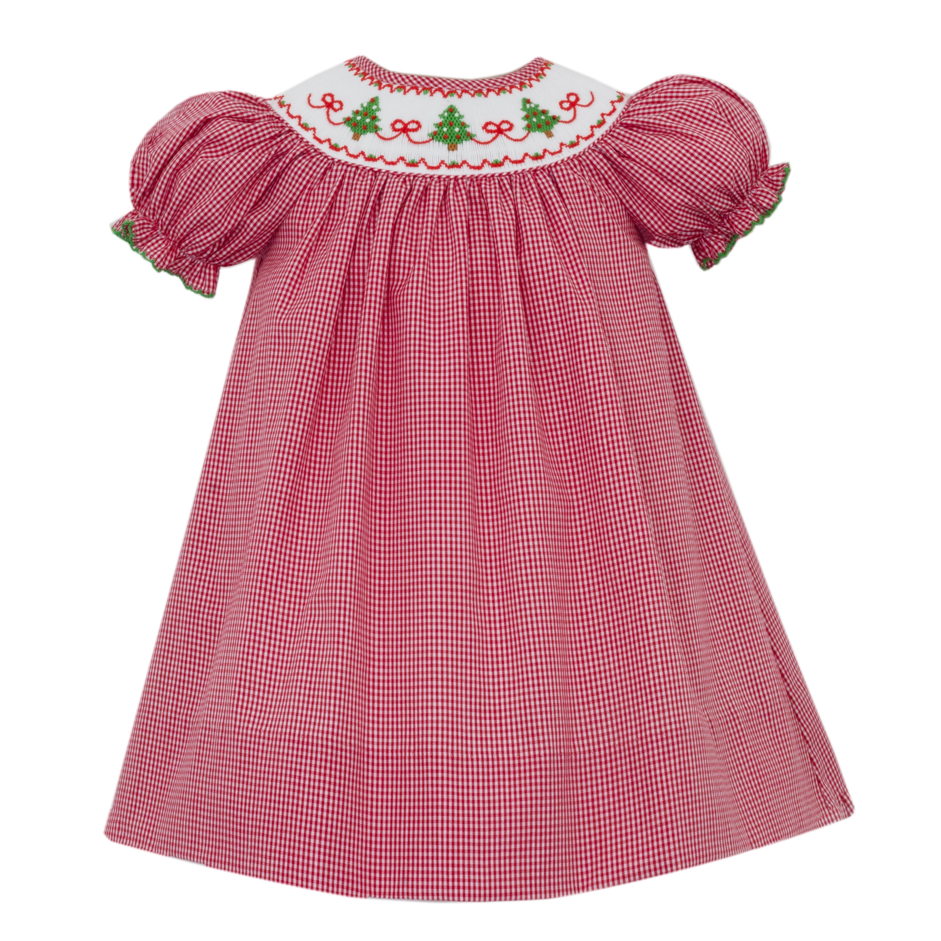 Petit Bebe- X'mas TREES W/BOWS - Red gingham bishop w/ insert S/S