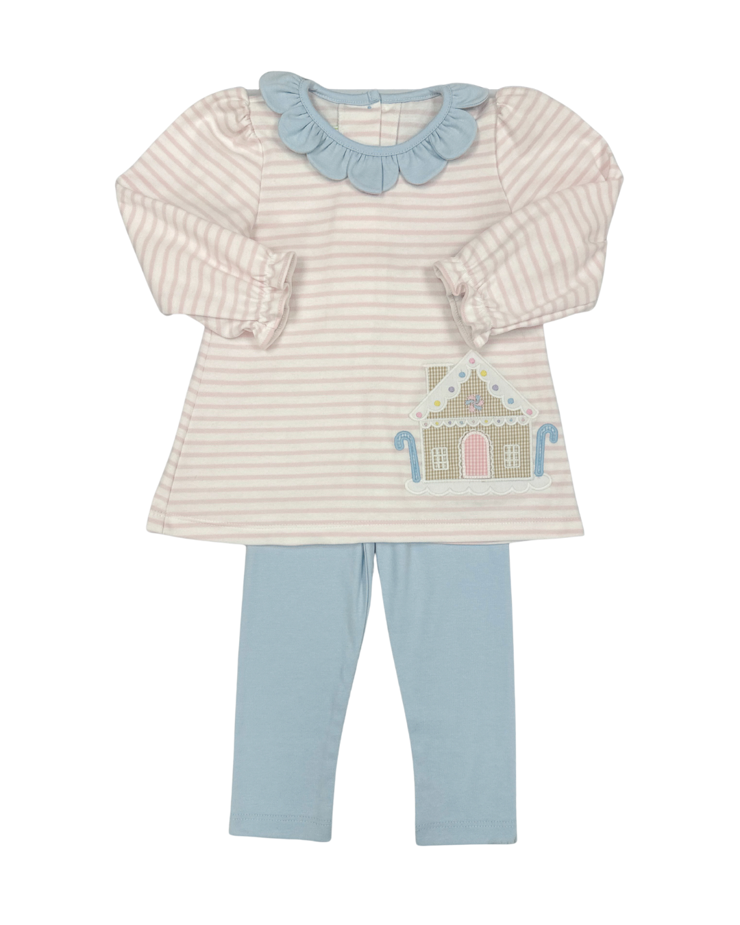Sweeten her holiday style with this charming set — a pink striped top paired with light blue knit leggings, finished with A delightful gingerbread appliqué. Perfect for cozy baking days and festive fun!