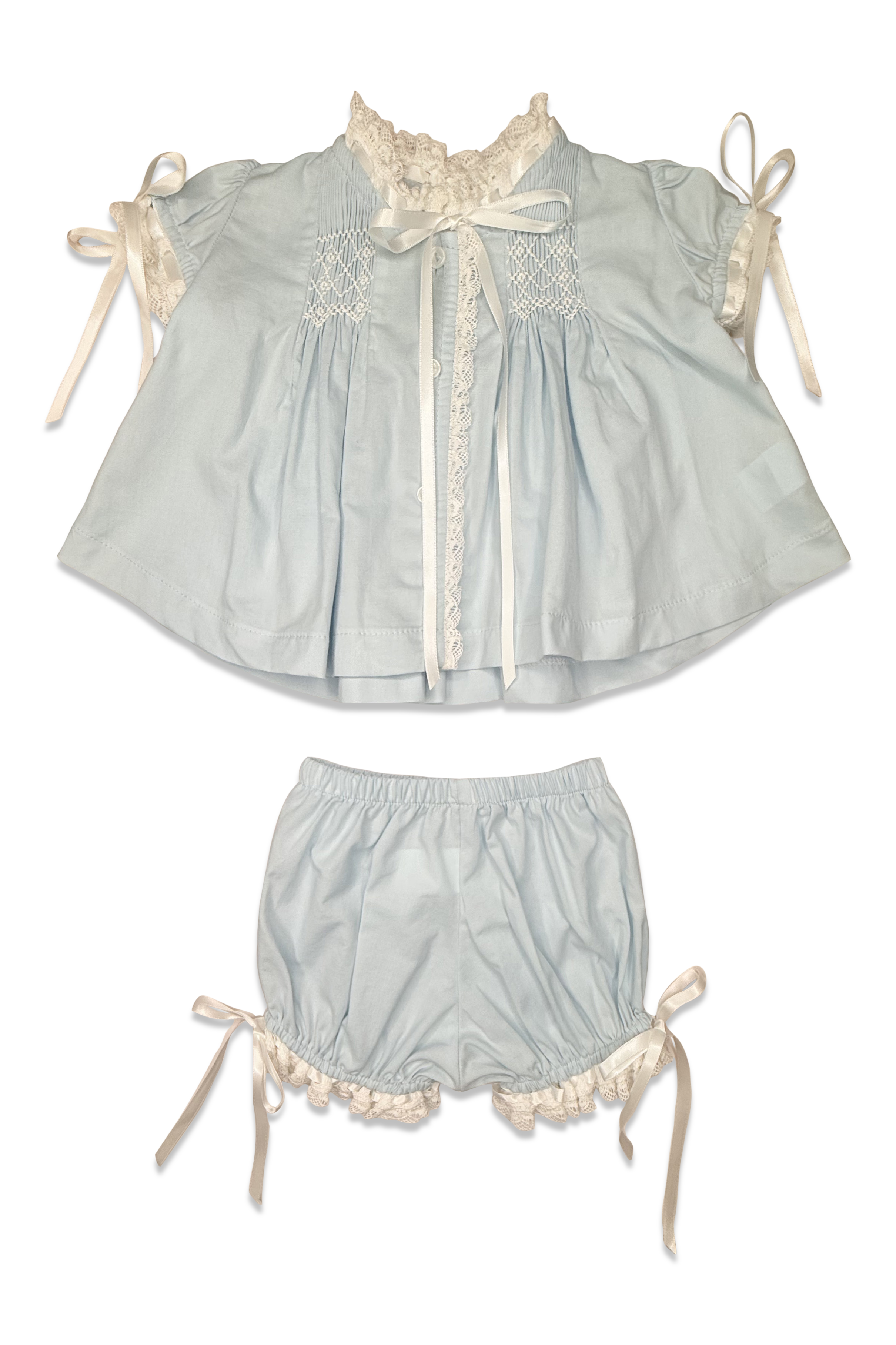 Percy & Tyne- Girls Heirloom Bloomer Set- Blue Batiste W/ White Smocking & Satin Ribbon