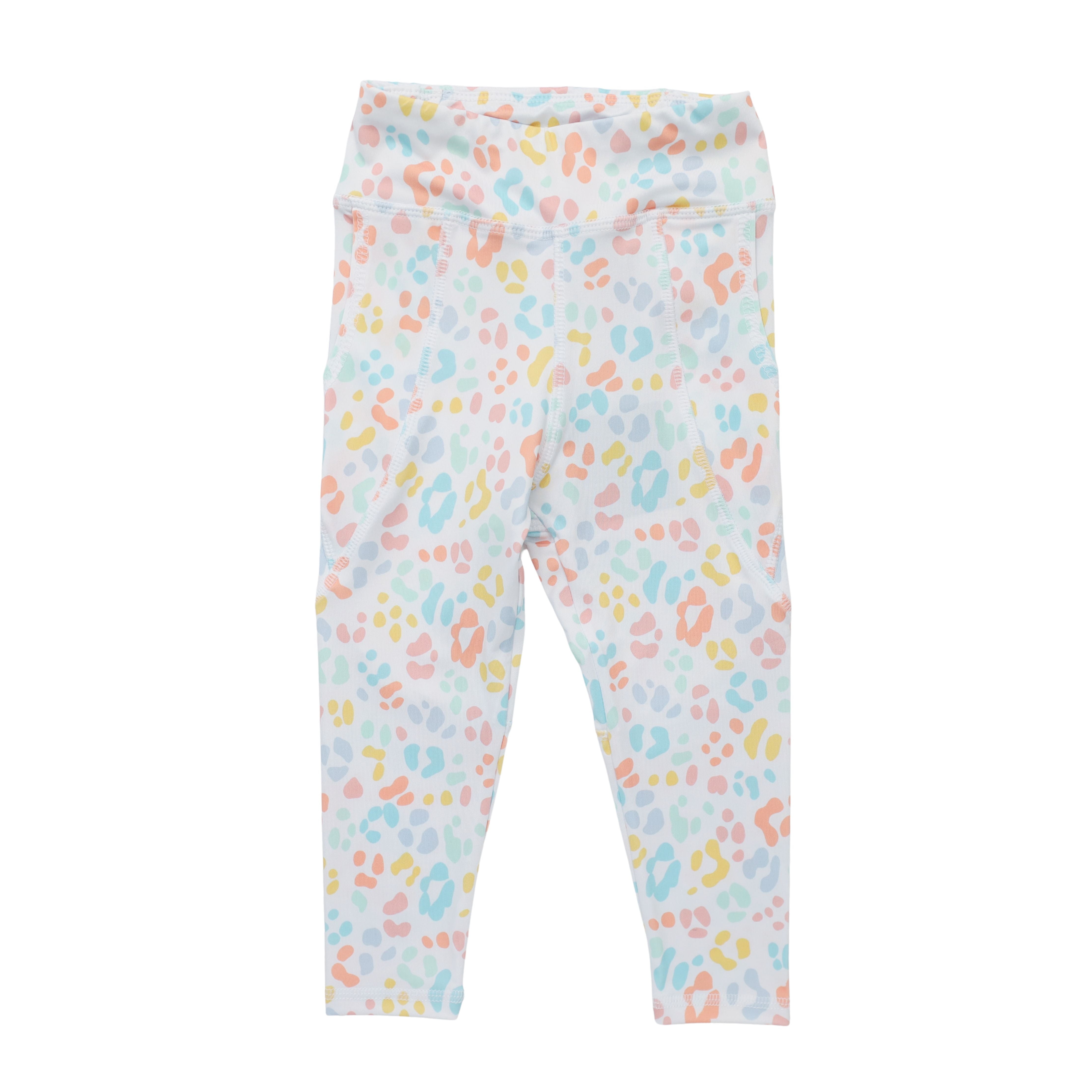 Brighten up her day with these multi colored leopard print athletic leggings. Made with stretchy fabric for comfort and performance. Bold, fun, and built to move—perfect for play, practice, or everyday wear.