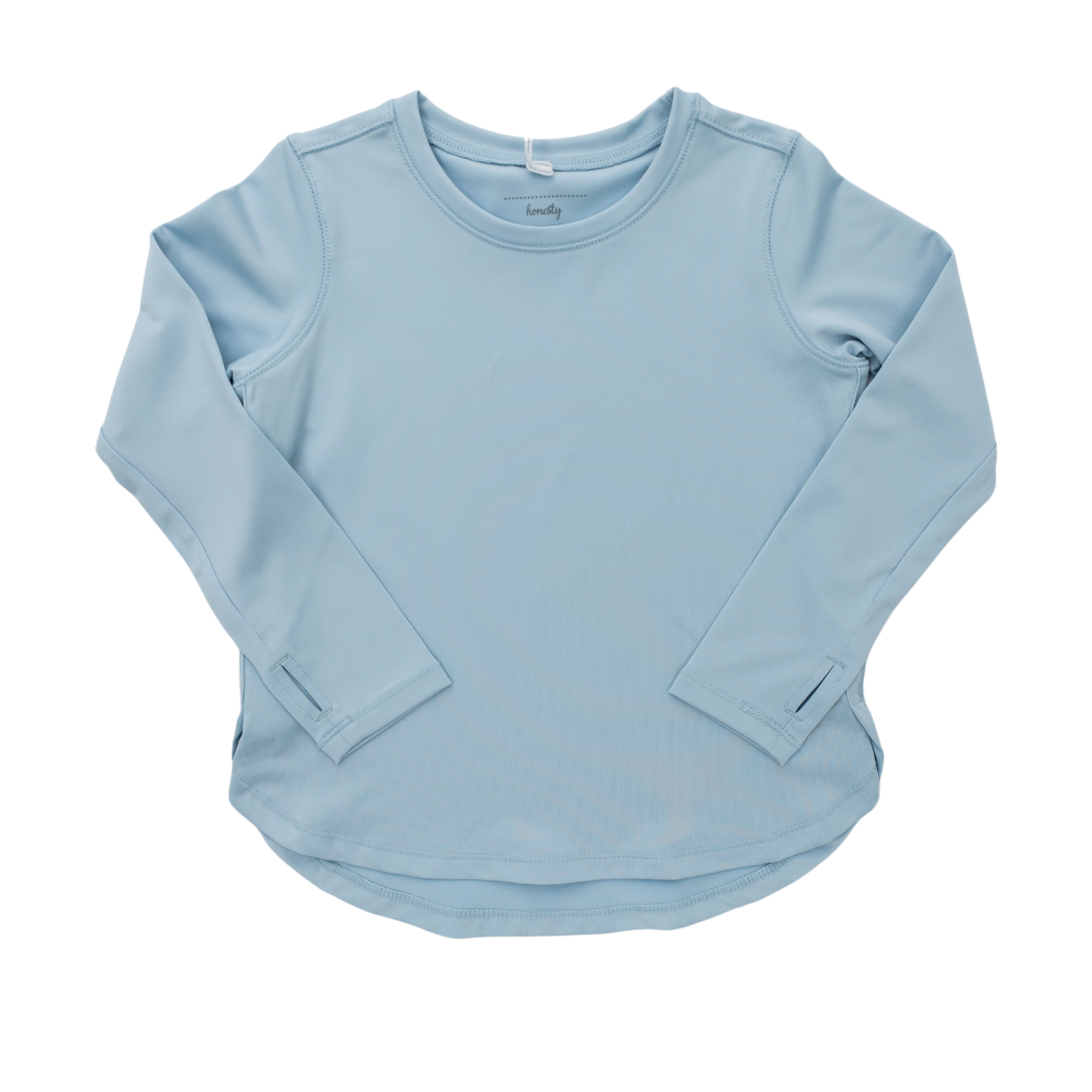 This athletic long sleeve shirt in light blue is designed for performance and comfort. Made with breathable, quick-dry fabric to keep her cool and focused. Perfect for training, layering, or casual everyday wear.