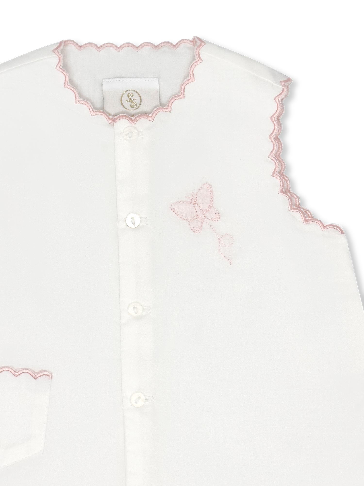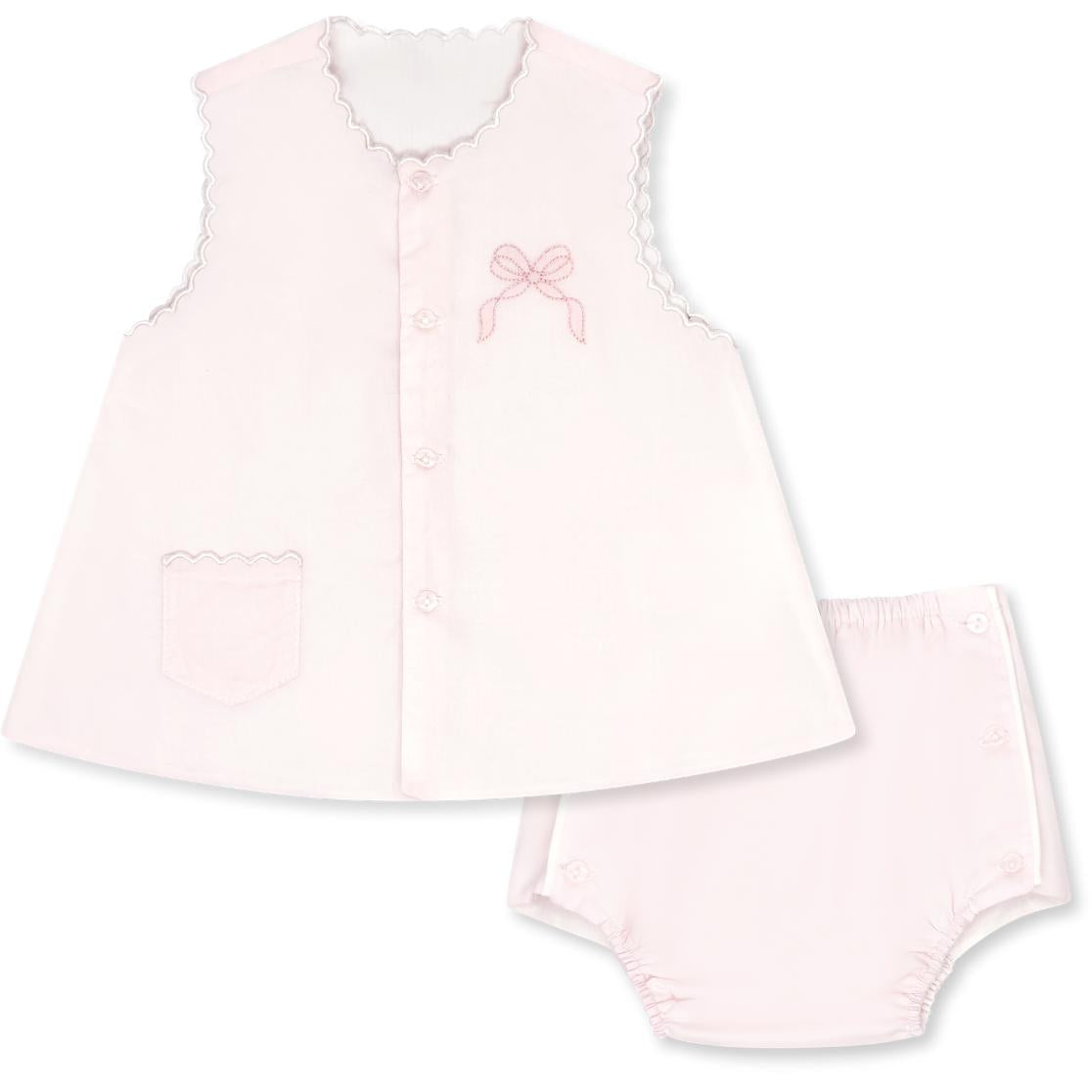 The Best Selling Maria Diaper Set in Blessings Pink Batiste is a classic and timeless piece, featuring delicate scallop detail and charming bow embroidery. Perfect for your little one's first moments, this set combines elegance and comfort, making it an ideal choice for special occasions or everyday wear.