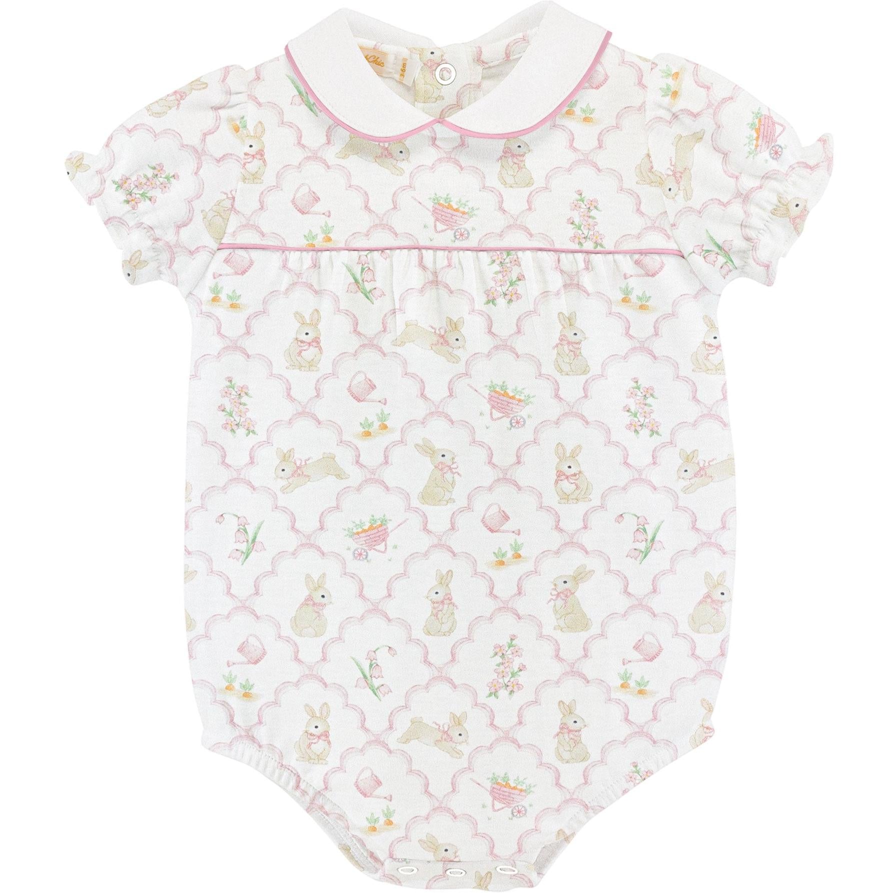 This adorable bubble featuring a charming bunny garden print, perfect for Easter celebrations and everyday wear. With convenient snap closures that make diaper changes quick and easy. Crafted from 100% Peruvian Pima cotton, this soft and breathable fabric keeps your little one comfortable all day long. The classic bubble silhouette with a Peter Pan collar adds a timeless touch to any outfit.