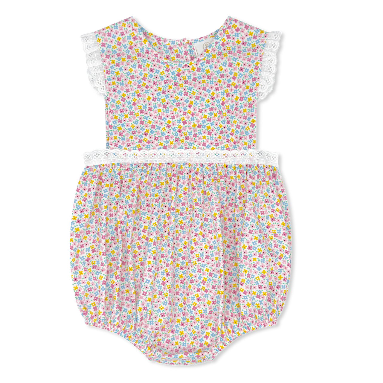 Featuring delicate white eyelet trim at the shoulders and yoke, this sweet bubble blends classic florals with thoughtful design. Soft, comfortable, and perfect for warm days it's a picture-perfect outfit for every occasion.