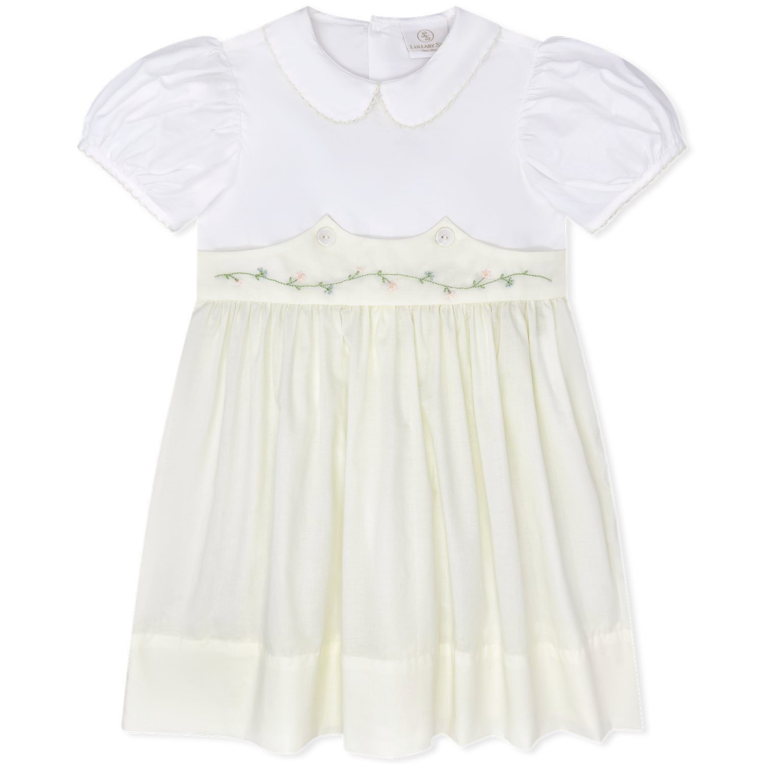 Sweet, classic, and full of charm, our Sunday's Best Dress features a crisp Blessings White top adorned with delicate floral embroidery and a soft Blessings Yellow skirt for a cheerful pop of color.