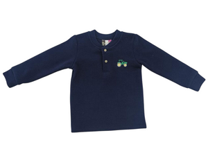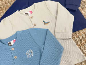 Stay stylish and playful with the Henley Shirt-Puppy. This blue shirt features a cute dog embroidery, perfect for adding a quirky touch to your outfit. Woof!