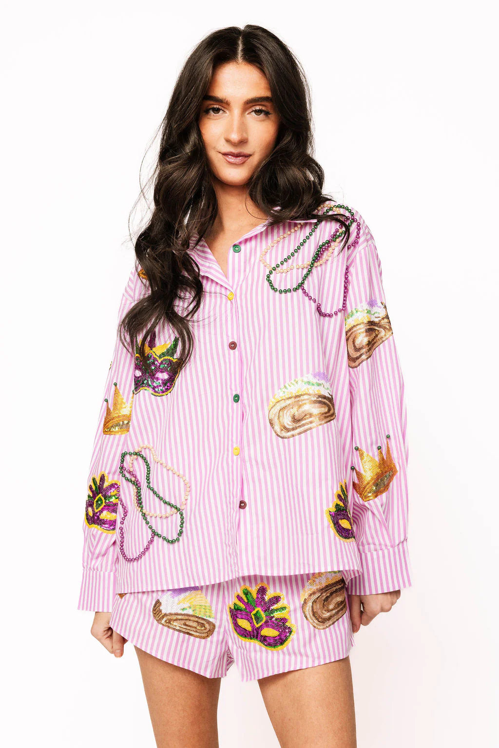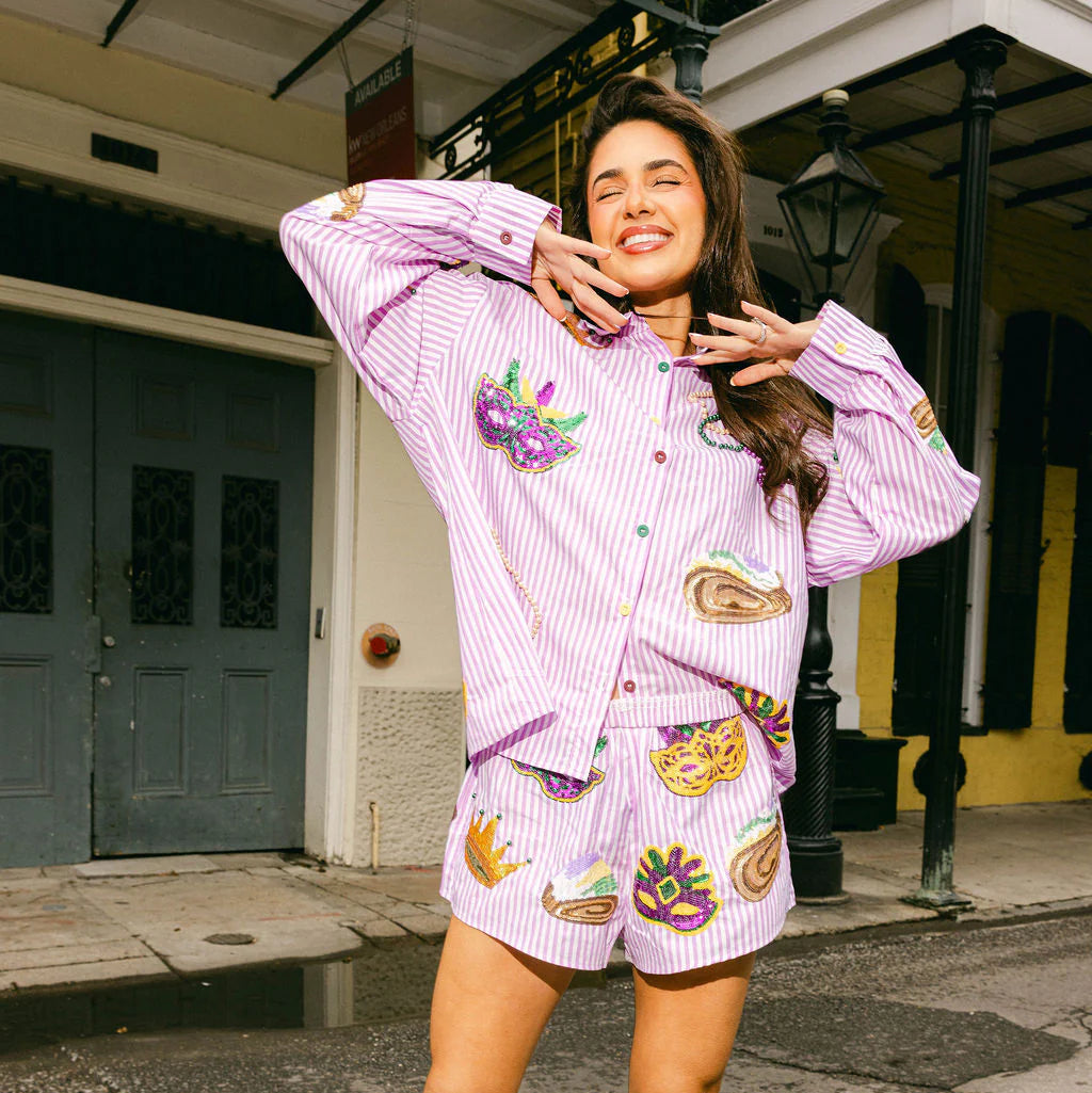 Get ready to turn heads in these vibrant purple and white striped shorts featuring eye-catching sequin Mardi Gras icons! Perfect for festival season or themed celebrations, these playful shorts bring instant party vibes to any outfit. The bold stripes and shimmering details make a statement, while the comfortable cotton construction keeps you feeling great all day long. Mix and match with the coordinating top to create a complete, show-stopping ensemble that's sure to sparkle!