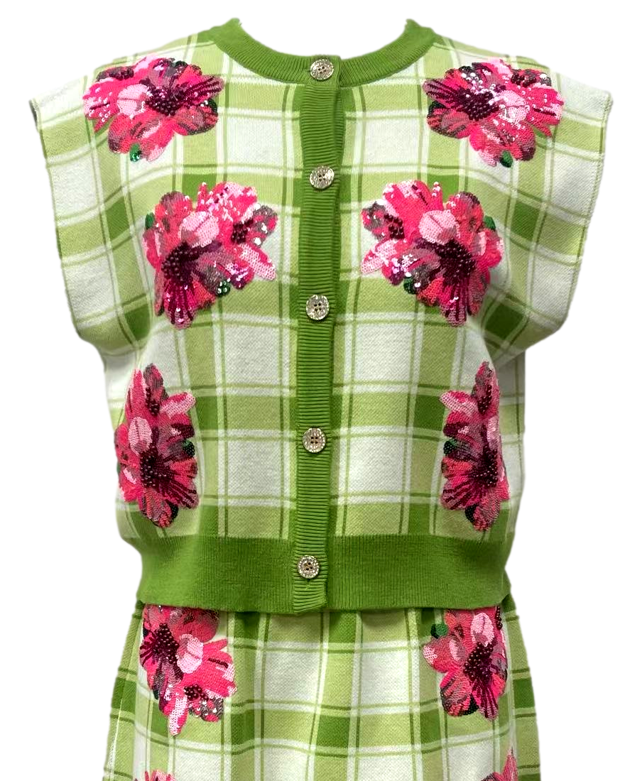 Queen of Sparkles- Green Plaid Azalea Button Up Tank Sweater- Green