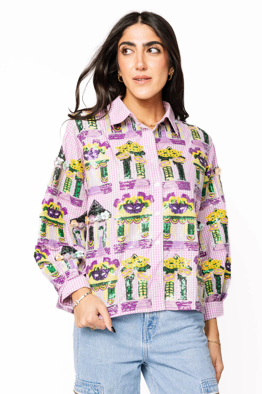 Step into the spotlight with this vibrant purple and white plaid button-up top, featuring an exclusive Mardi Gras porches design that brings festive flair to your wardrobe. Whether you're celebrating the season or making a bold fashion statement, this playful piece delivers personality and pizzazz. Dress it up or down—this top is your ticket to standing out in style.