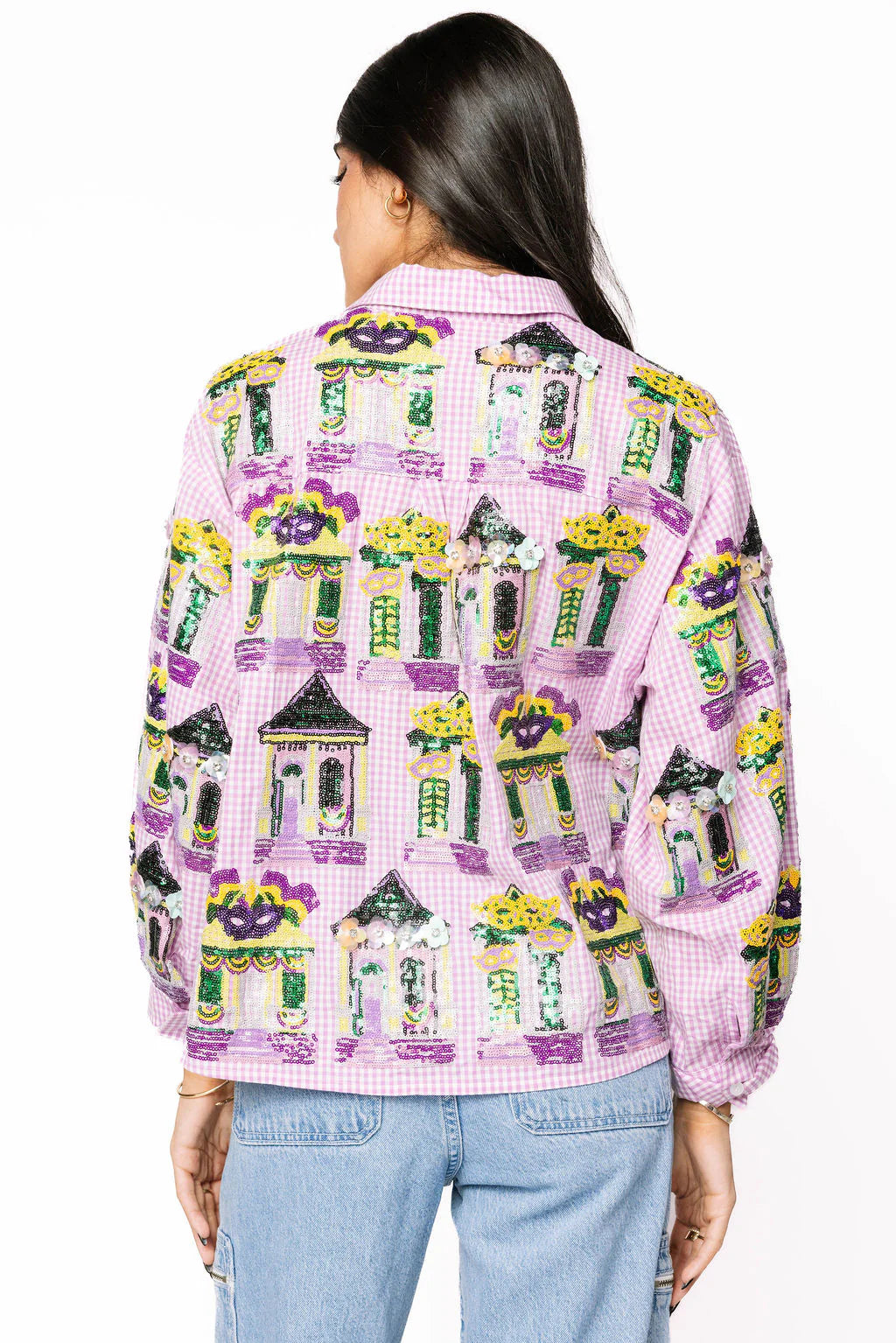 Queen of Sparkles- Purple & White Gingham Mardi Gras Porches Button Up Top- Purple