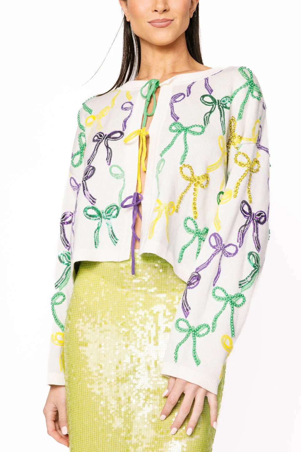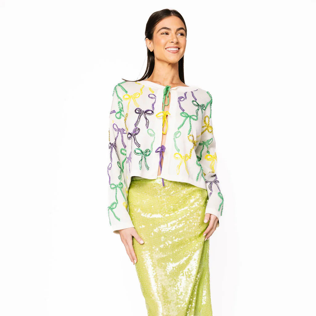 Get ready to turn heads this Mardi Gras season in this show-stopping white cardigan! Adorned with vibrant purple, yellow, and green bows, this tie-front sweater brings all the festive fun straight to your wardrobe. The playful bow details and adjustable tie closure create an instantly celebratory look that's perfect for parades, parties, and all your holiday festivities.
