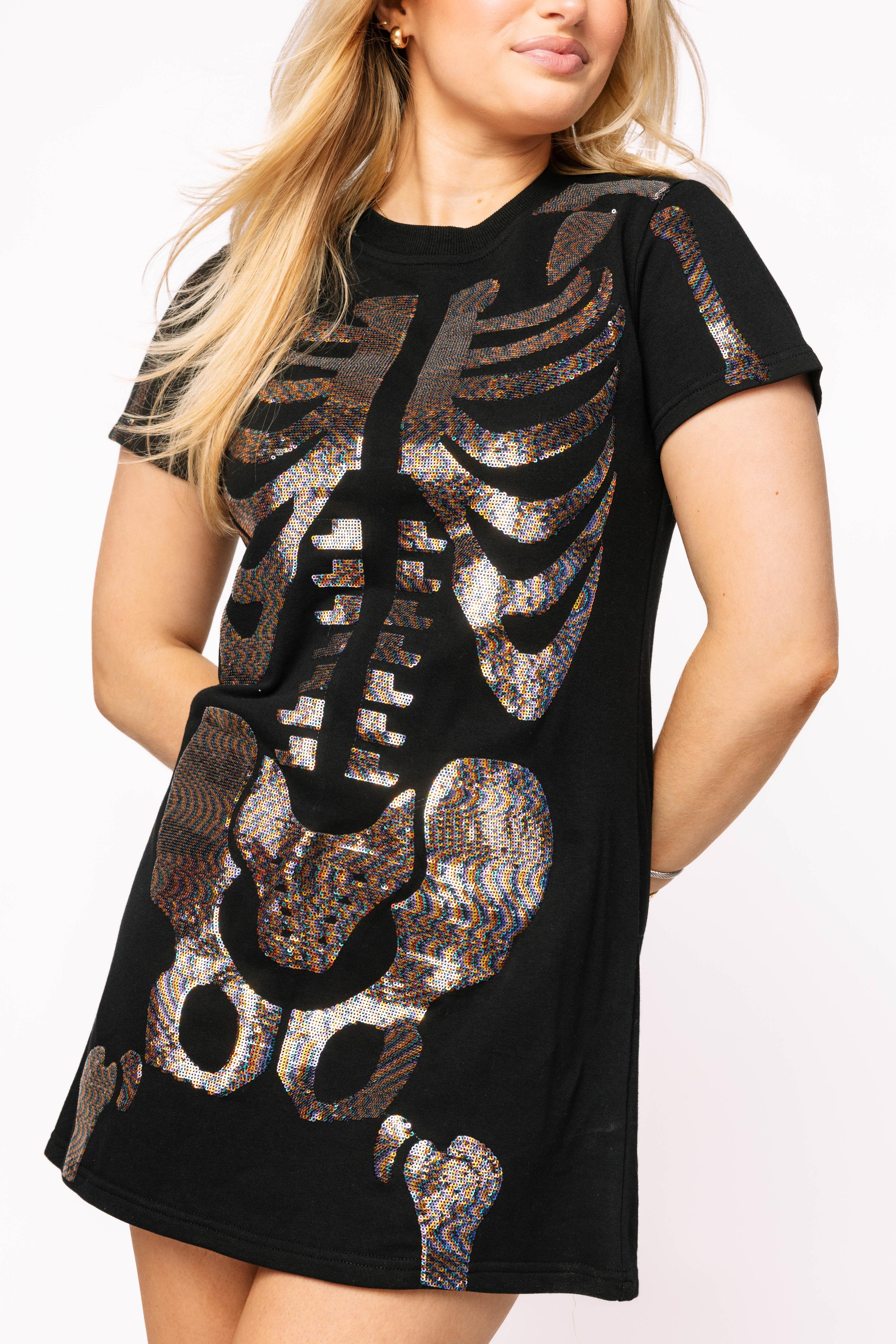 Queen of Sparkles- Black Multi Skeleton Body Tee Dress- Black