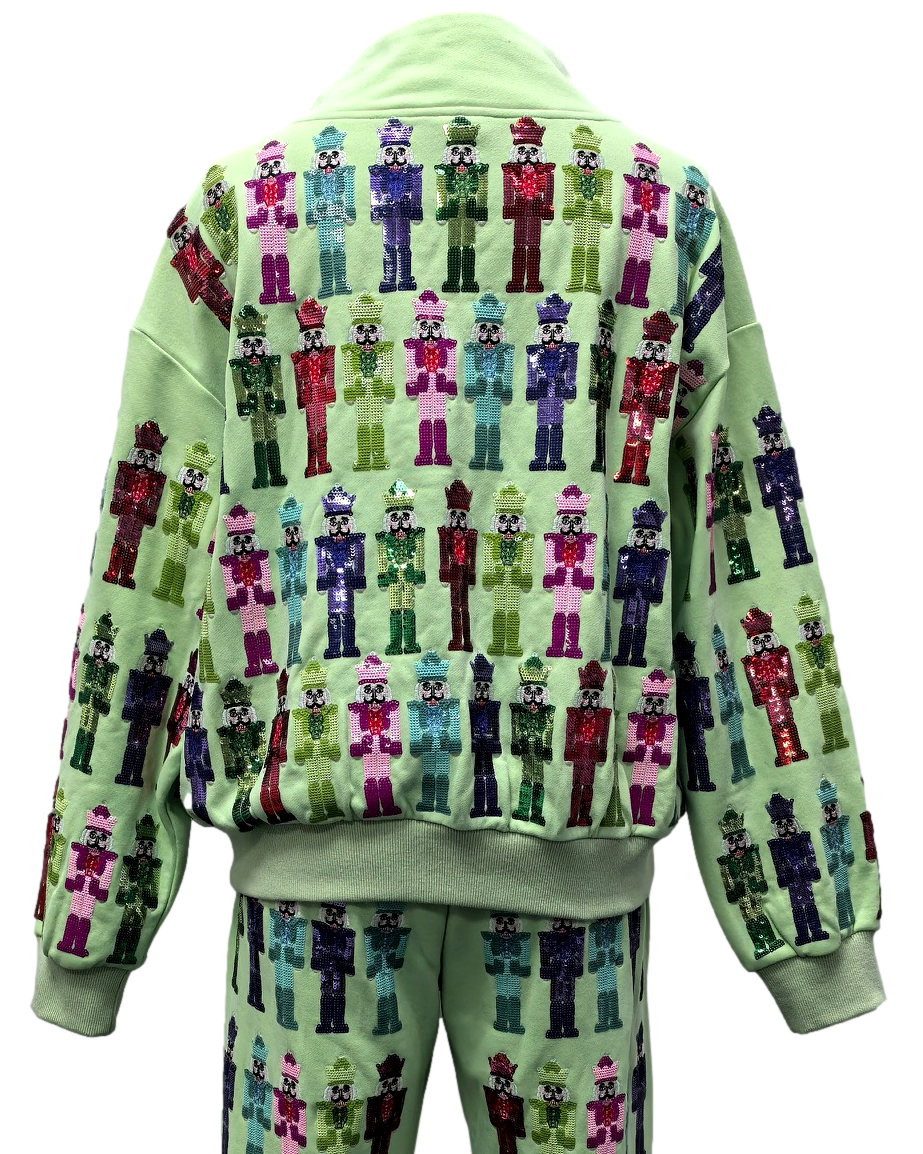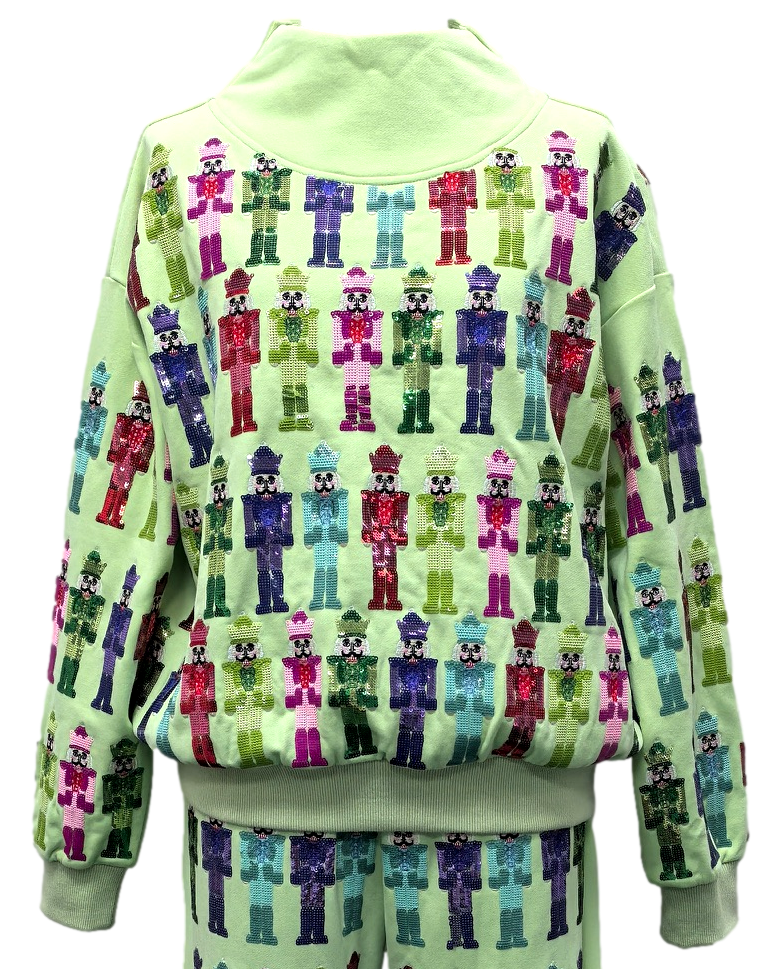 Embrace festive fun in this mint mockneck sweatshirt, featuring a lively pattern of multi-colored nutcrackers. Cozy and cheerful, it’s perfect for holiday gatherings or cozy days at home. Pair it with the matching bottoms for an effortlessly playful and coordinated look.