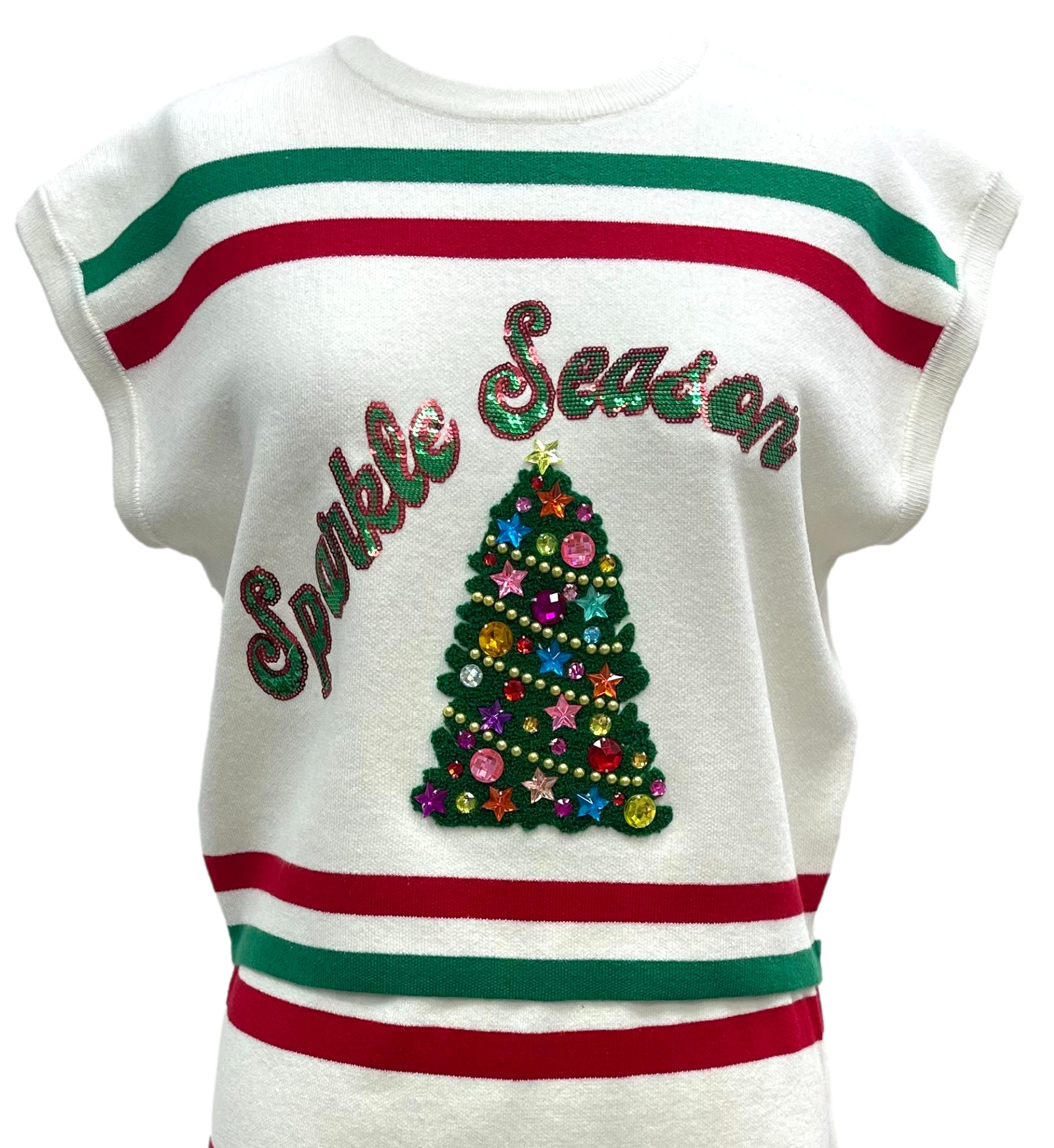 Queen of Sparkles- White, Red & Green Stripe 'sparkle Season' Short Sleeve Top- White