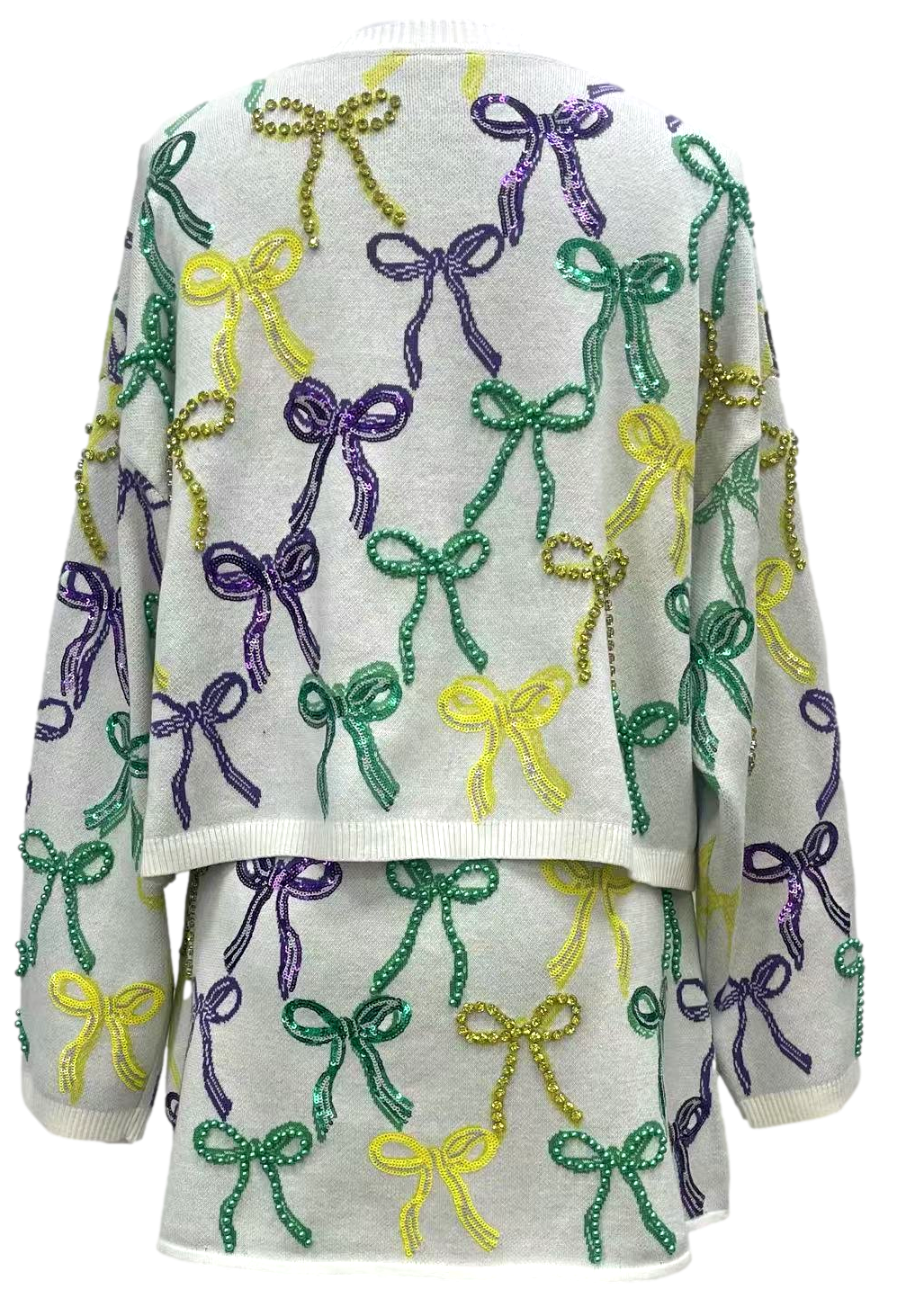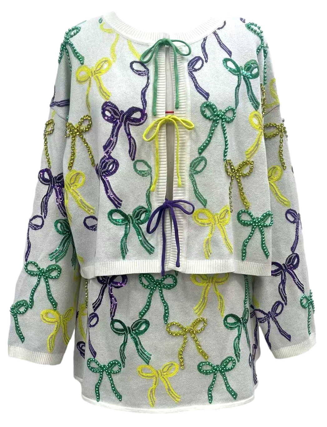 White Mardi Gras Bow Tie Up Sweater- (Women's)