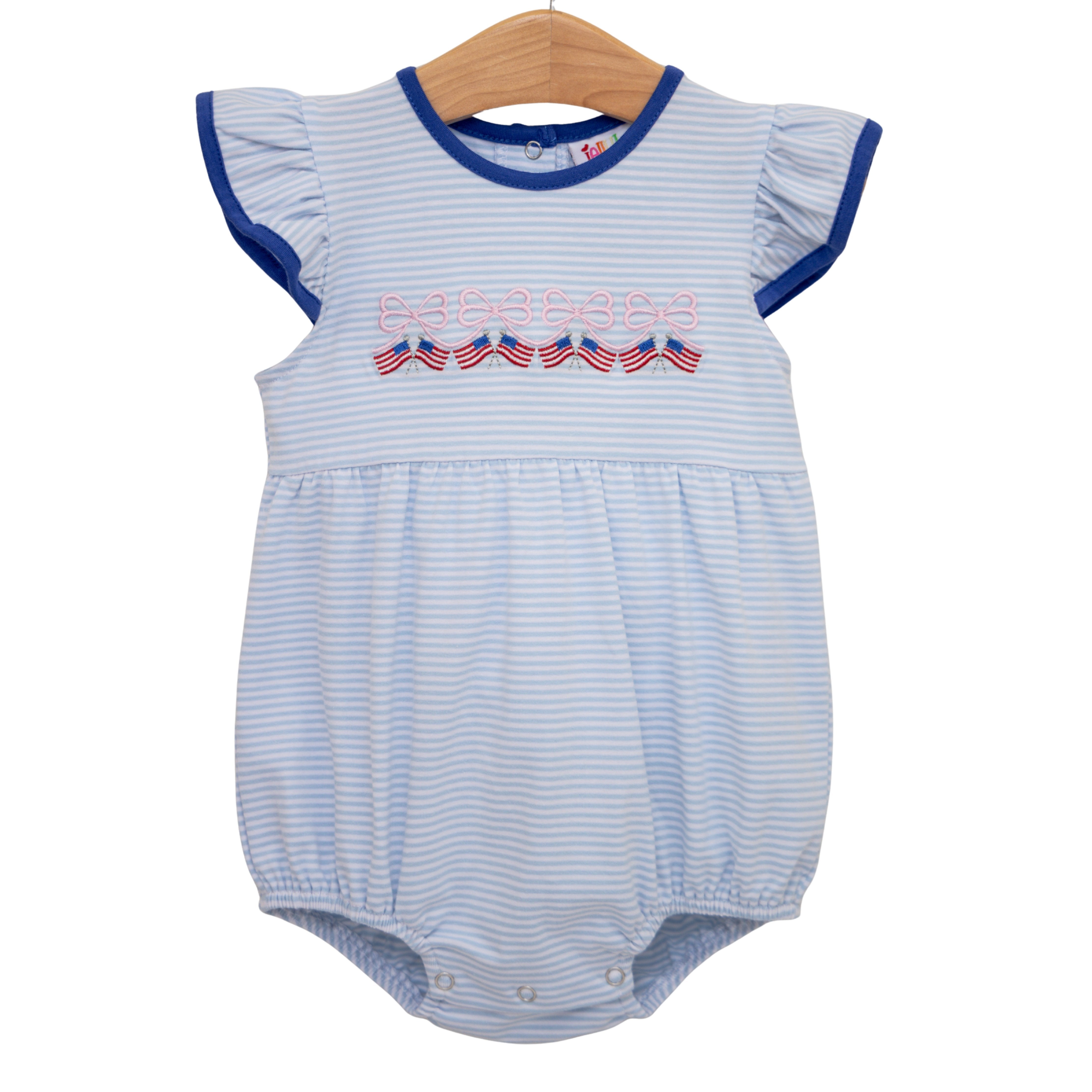 - Embroidered with American flags and light pink bows