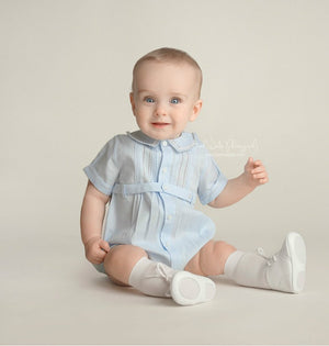 A classic baby girl outfit - perfect for Easter, special occasions, or as a baby gift! This lightweight baby romper features timeless lace, as well as hand embroidered rose bullions.