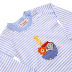 Dress your little girl in the sweet comfort of the Noah's Ark Ruffle Romper. Made from soft Pima cotton, this long-sleeve romper features a charming ruffle collar and playful crochet animals on Noah’s Ark. Perfect for keeping her cozy and stylish during playtime or quiet moments alike.