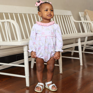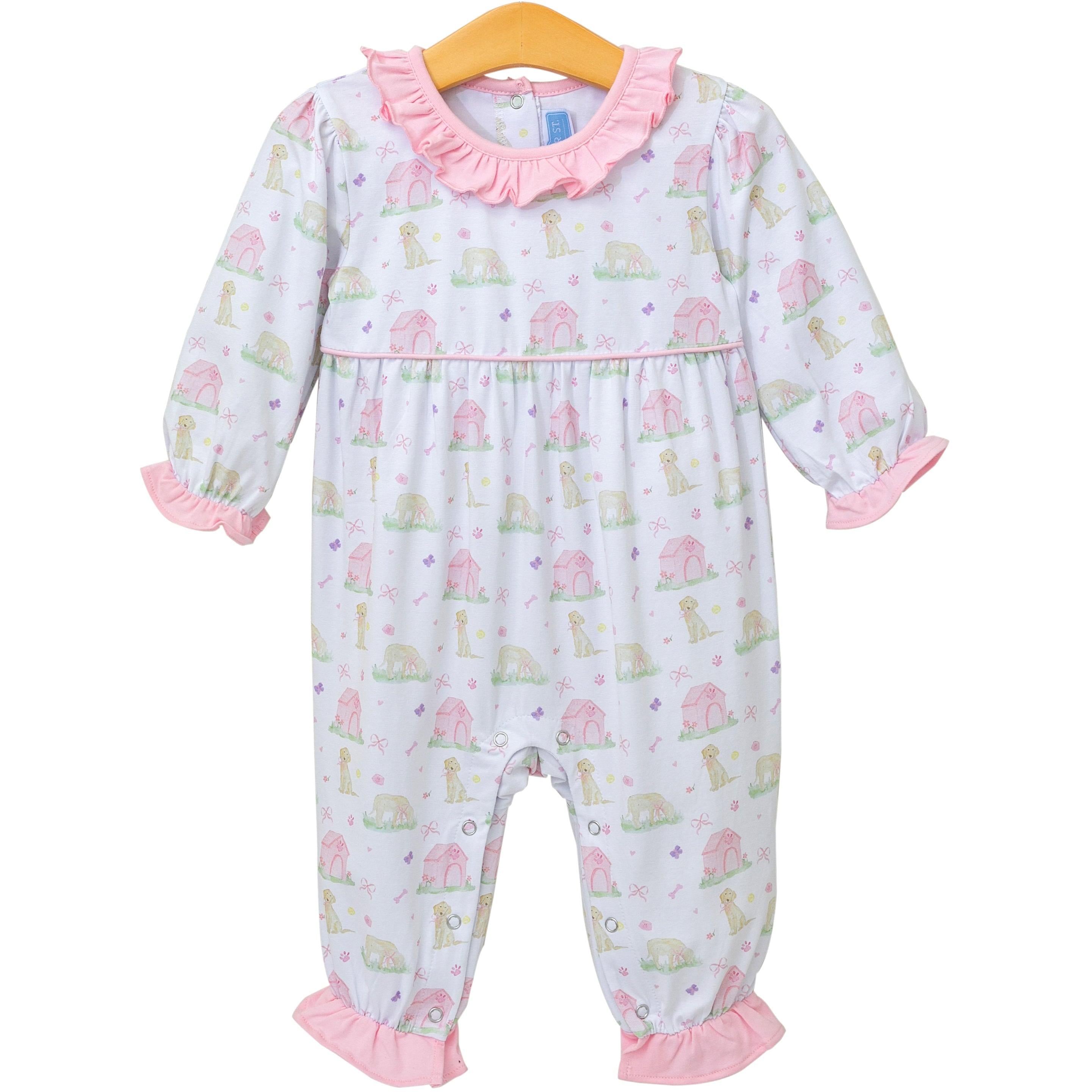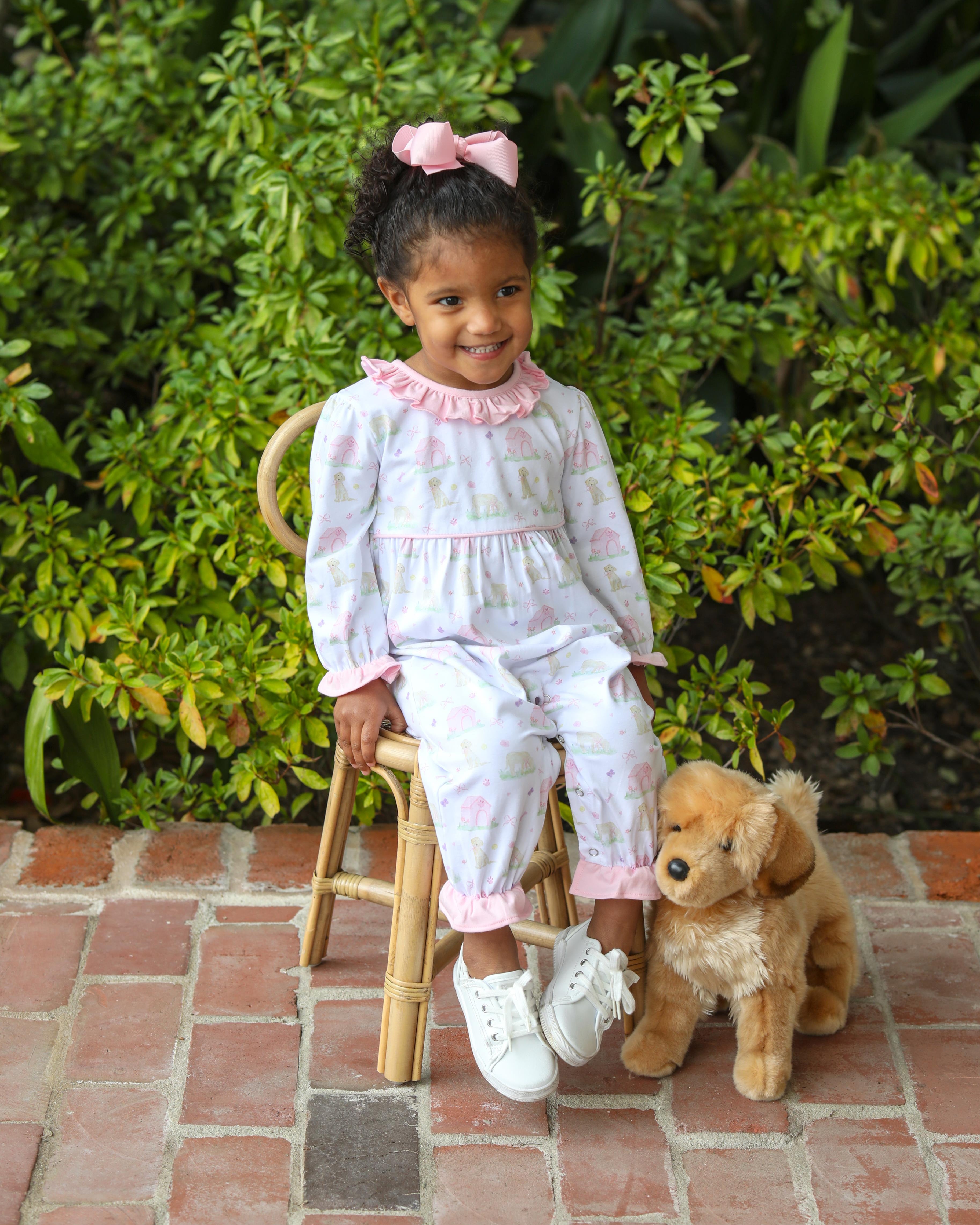 Bring playful puppy fun to your girl's wardrobe with the Puppy Pals Ruffle Romper.