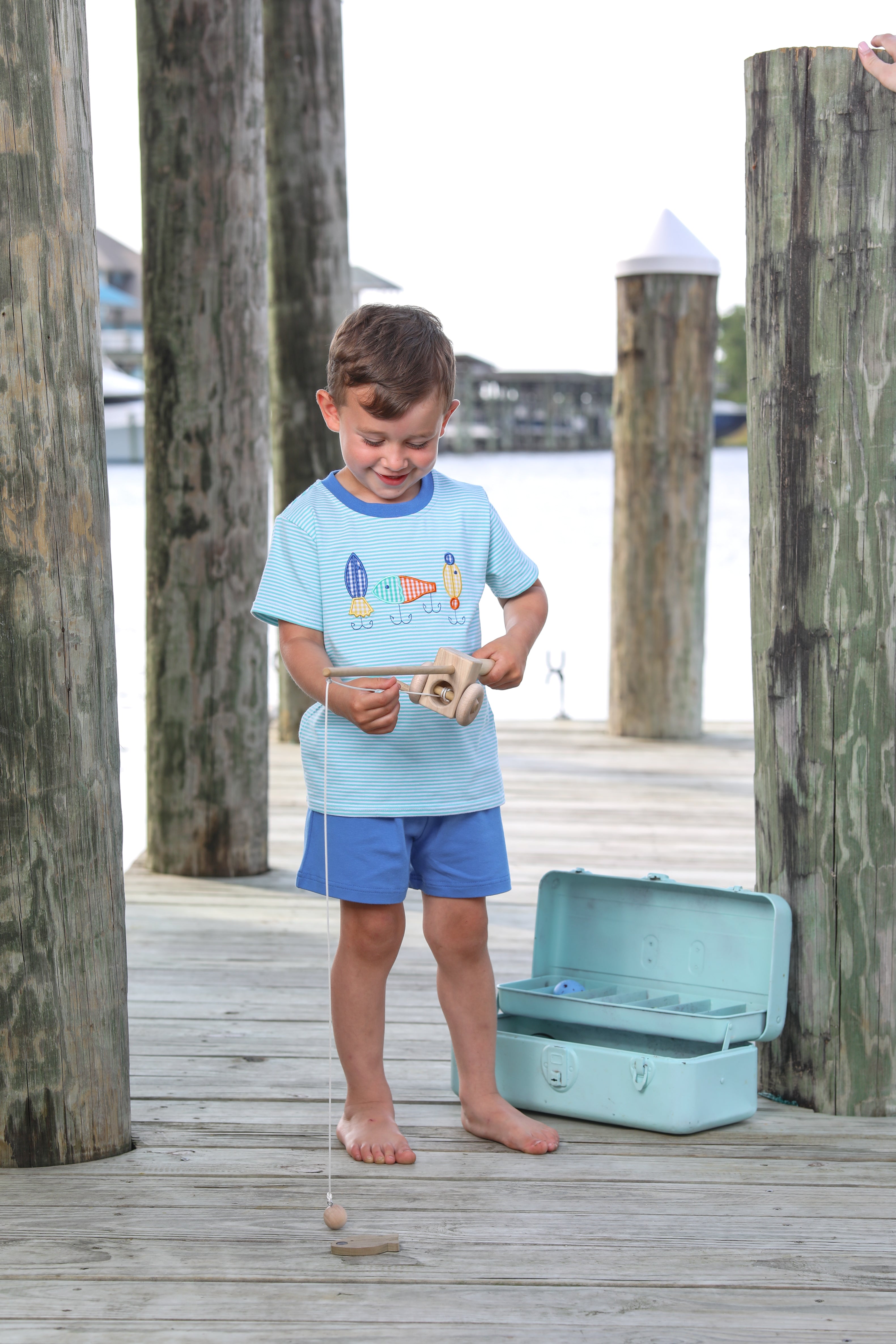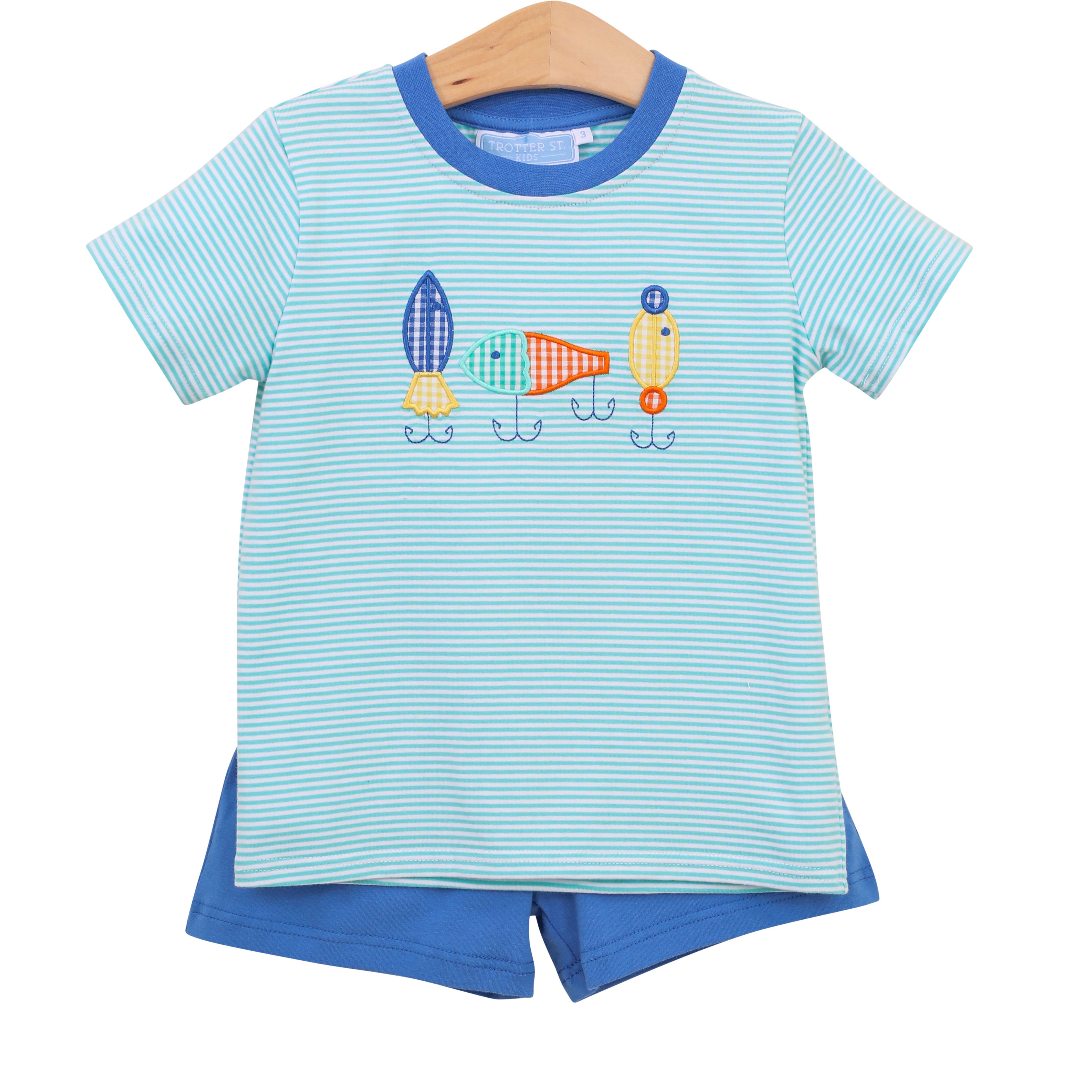 Hook, line, and sinker - this short set is perfect for fishing enthusiasts! Features fishing lure appliques and bold colors, with a handy tackle box for all your fishing necessities. Whether on the water or in the great outdoors, catch some fun in this quirky and bright set.