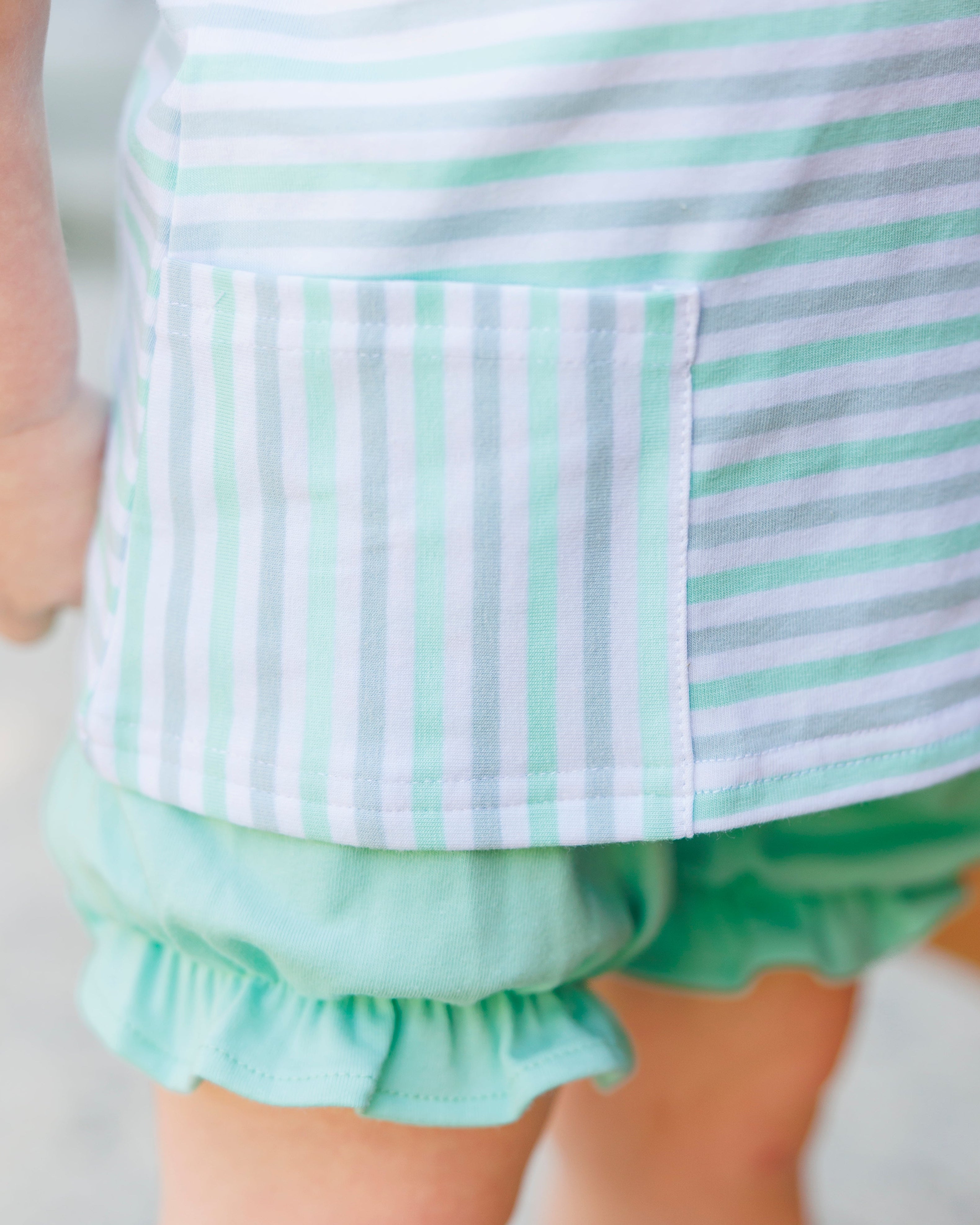 - Sleeveless light blue, mint and white stripe top with functioning pockets