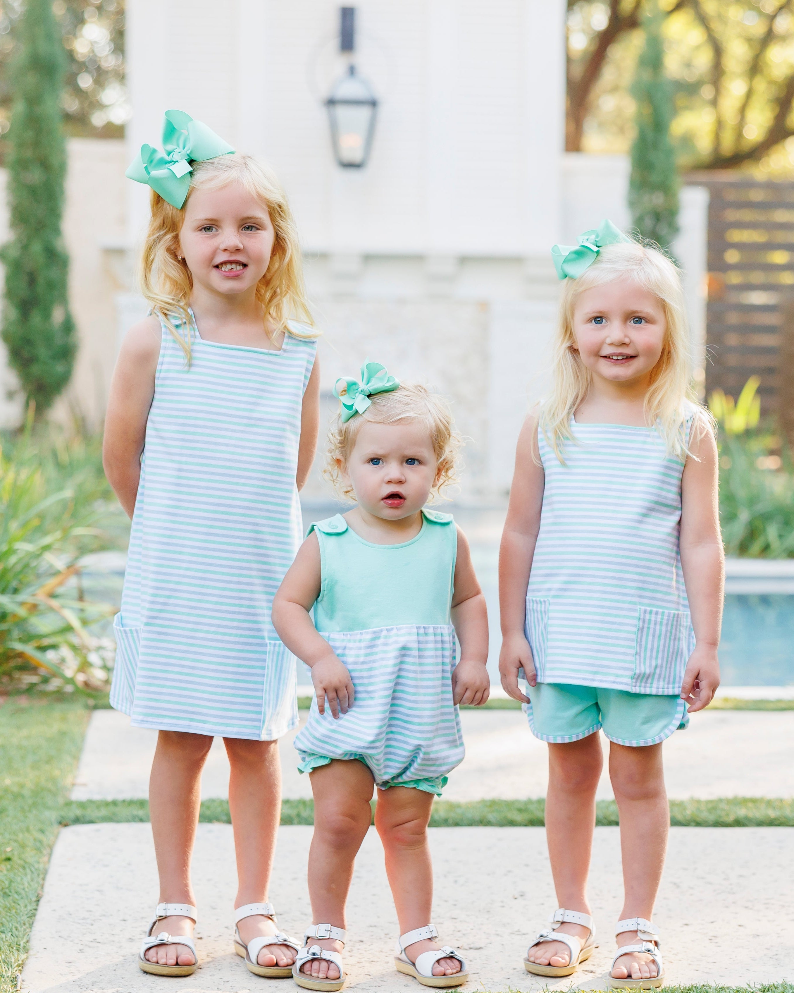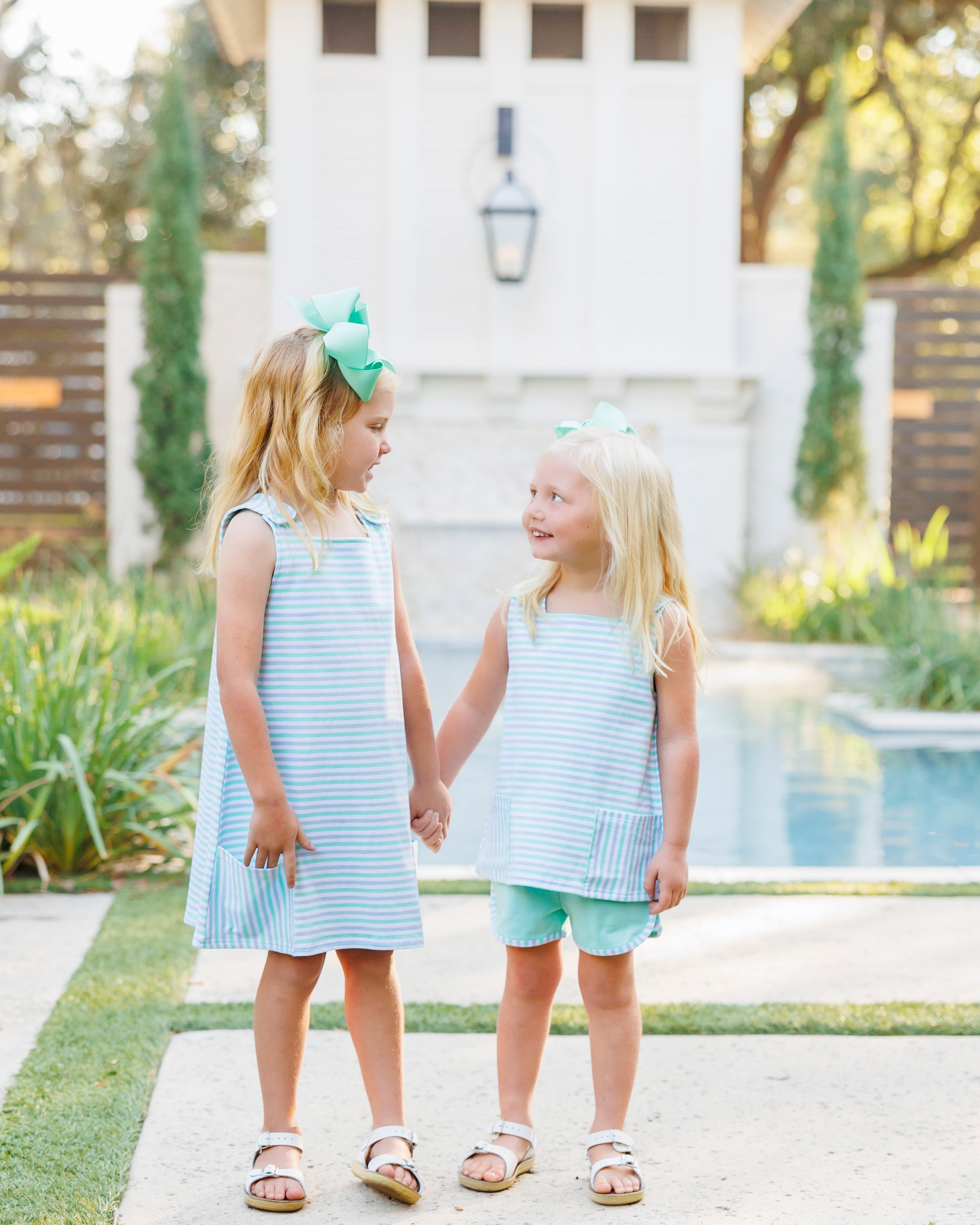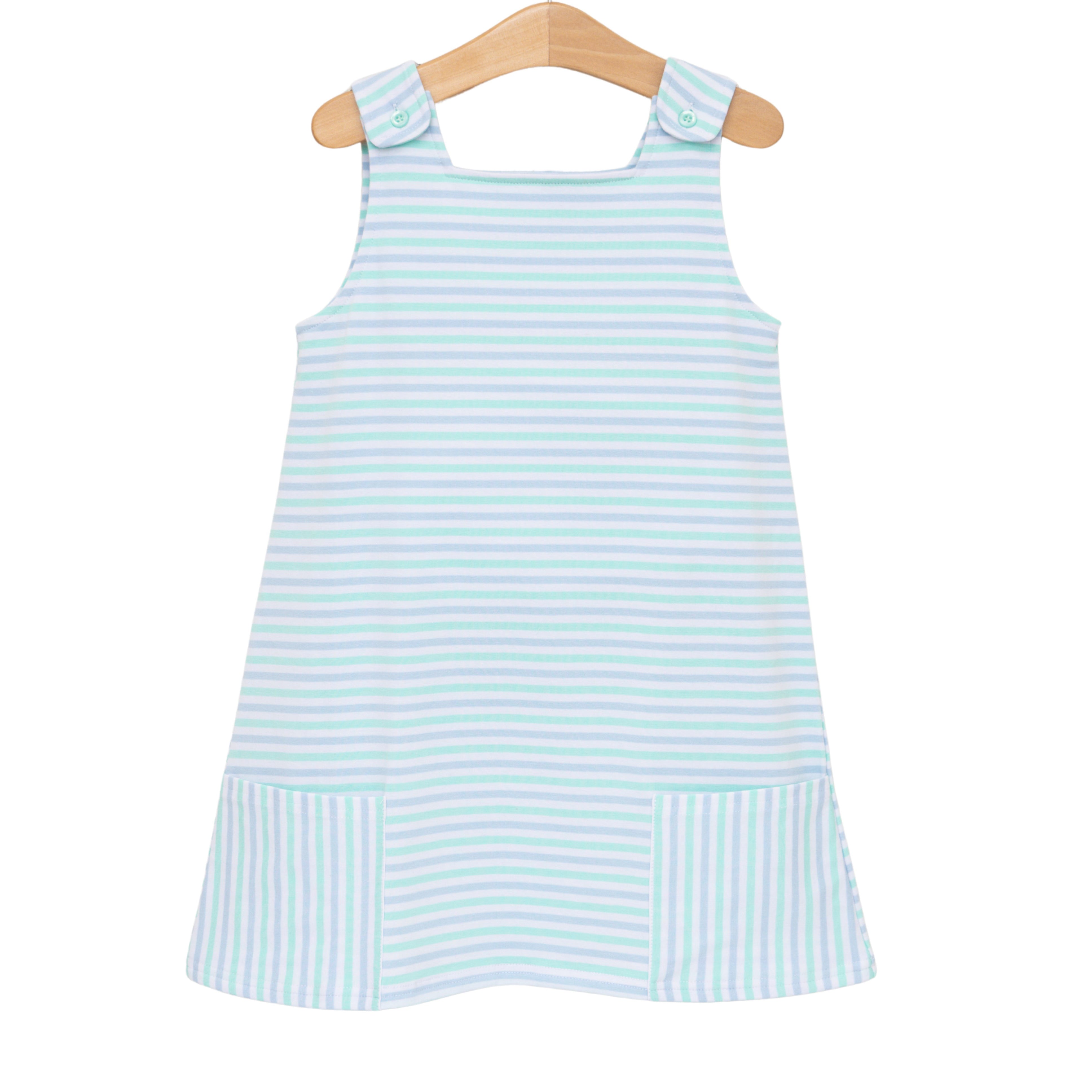 - Sleeveless light blue, mint and white stripe dress with functioning pockets