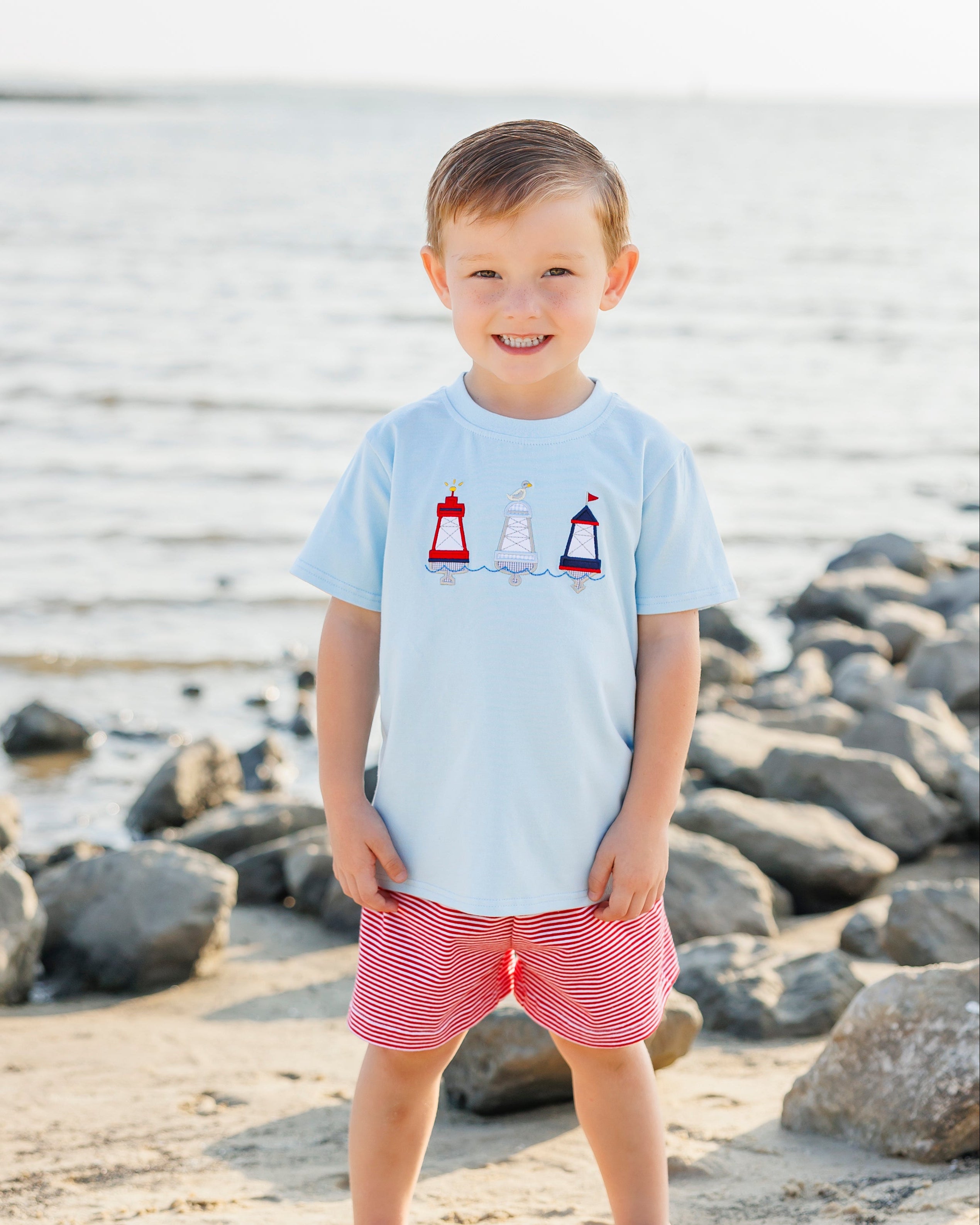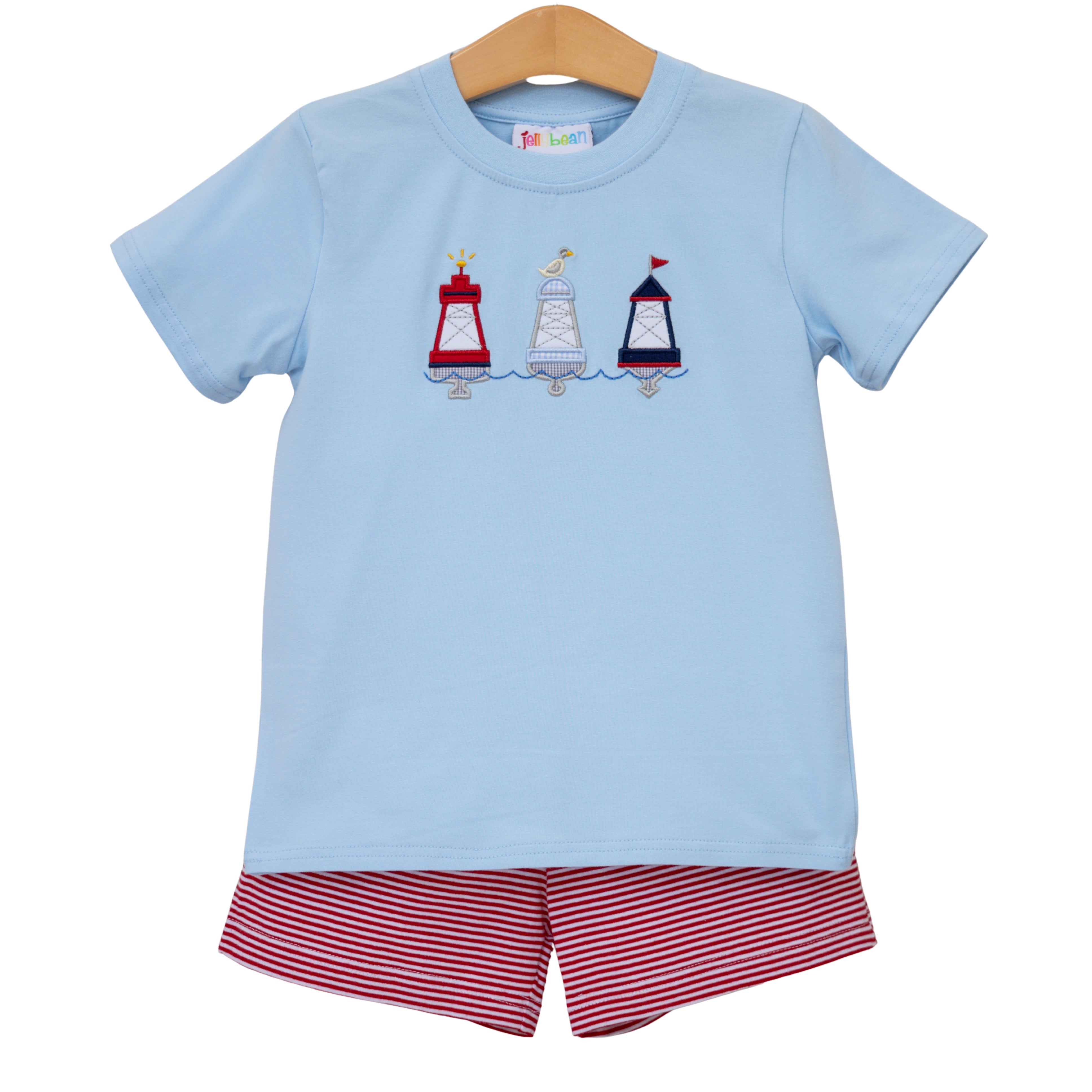 Set afloat in seaside style with our Red, White, and Buoy Short Set!