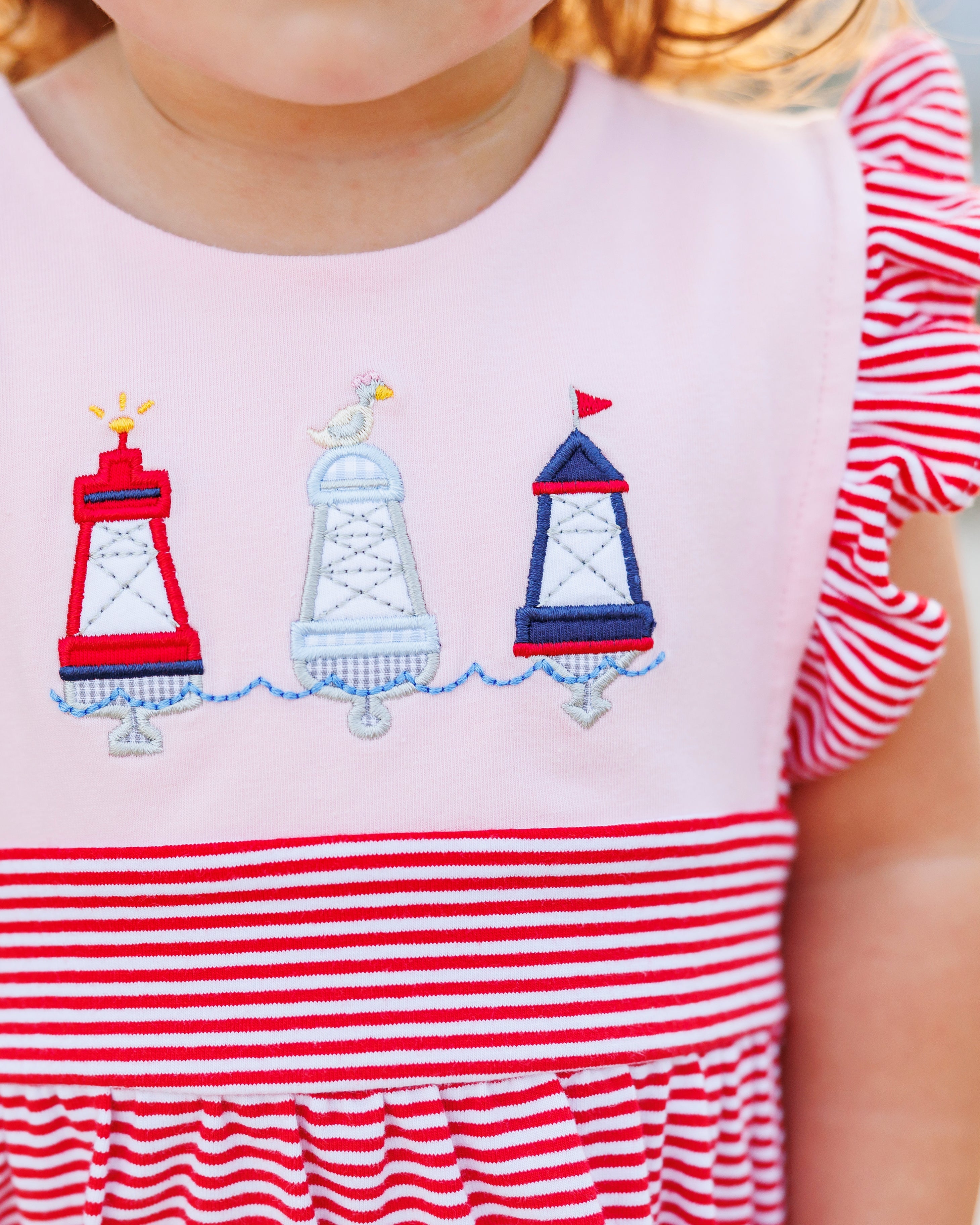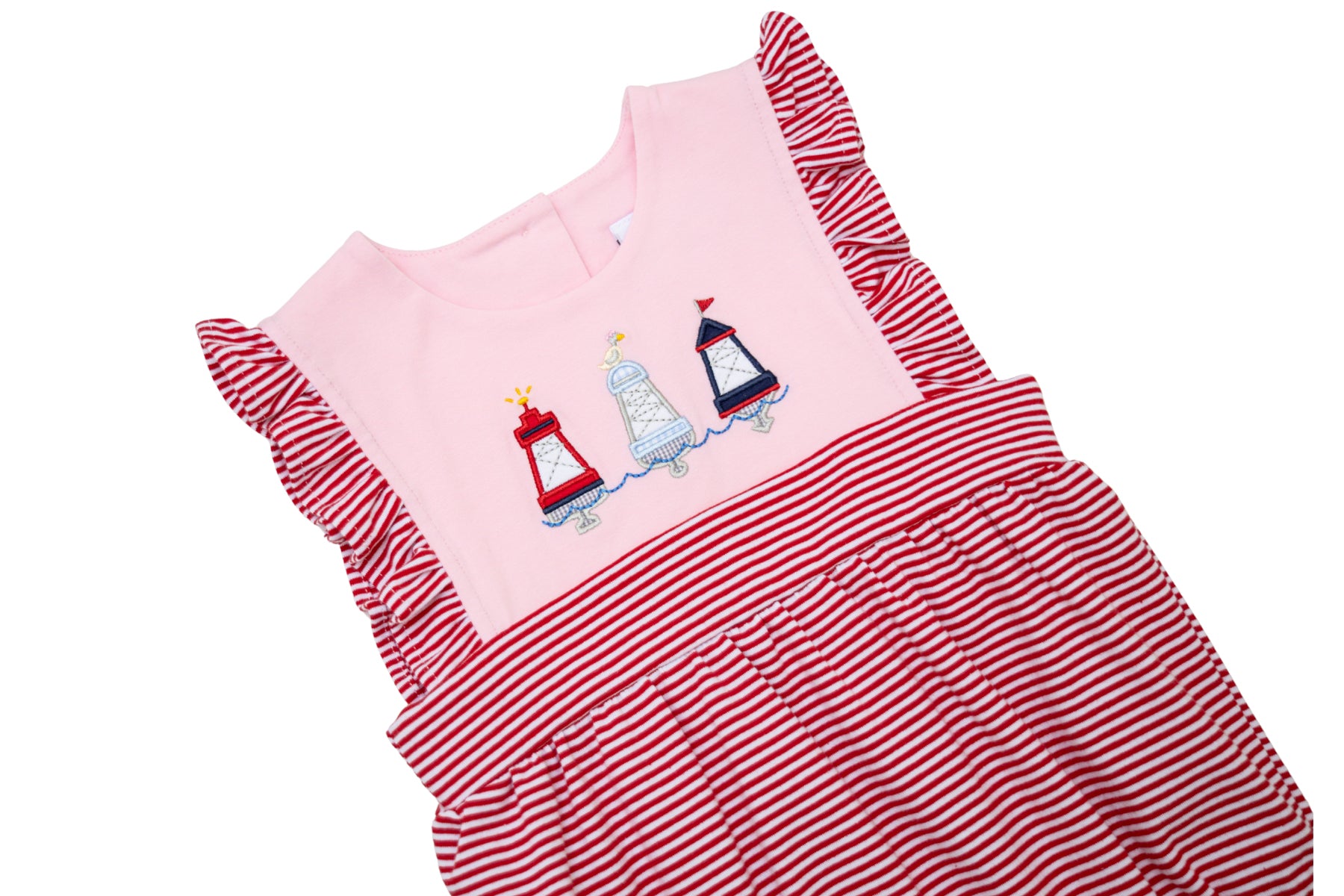 - Sailboat applique with gingham and multi-stripe sails on the bodice