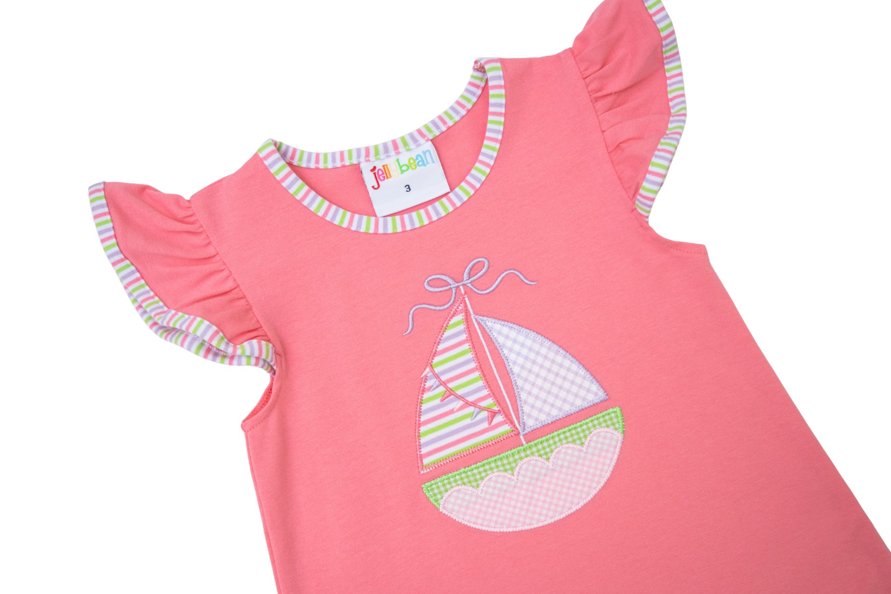 - Flutter sleeve top with a sailboat applique with gingham and multi-stripe sails