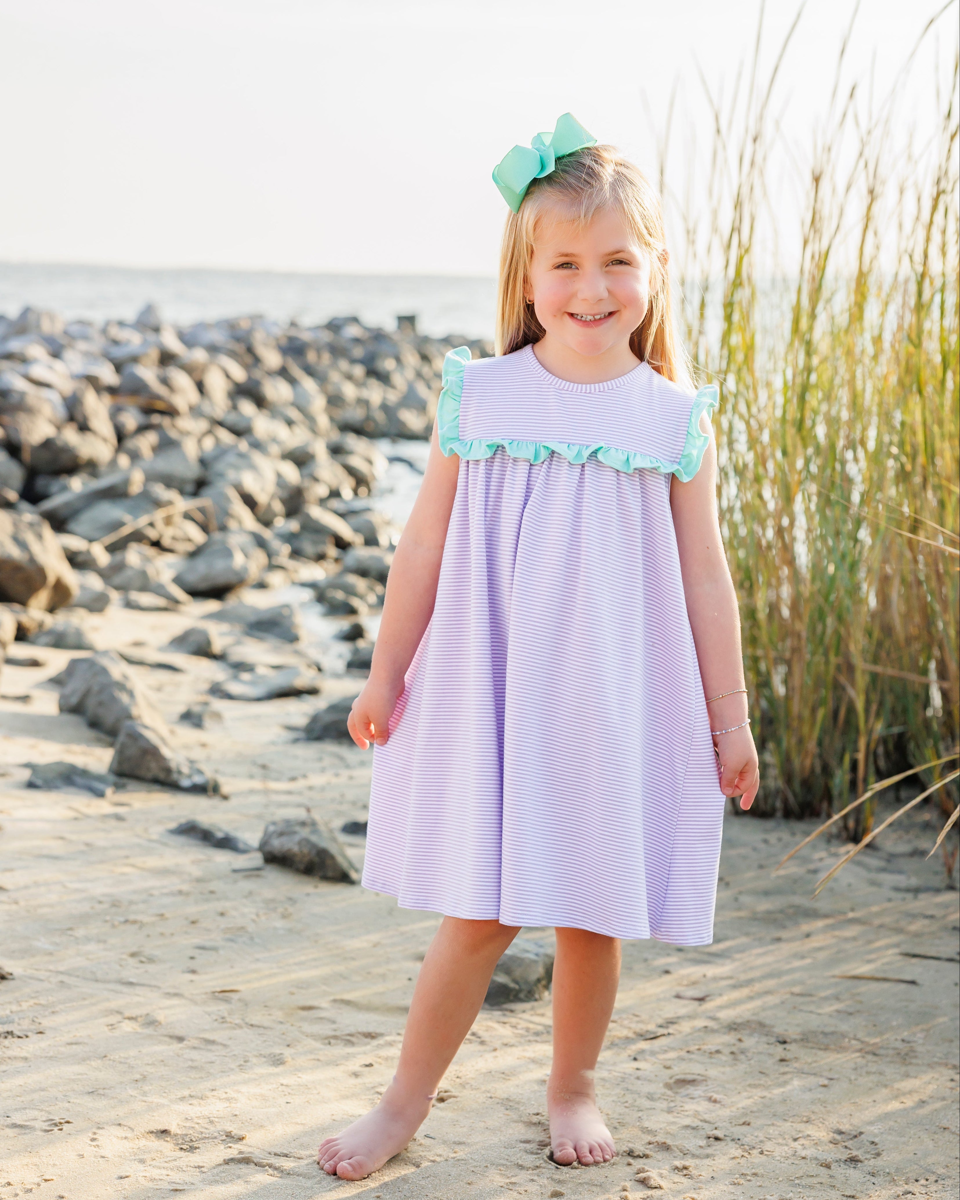 Whether it’s playtime or sunny outings, our classic Bella Dress in Lavender Stripe and Mint keeps your little girl cute, comfy, and summer-ready.