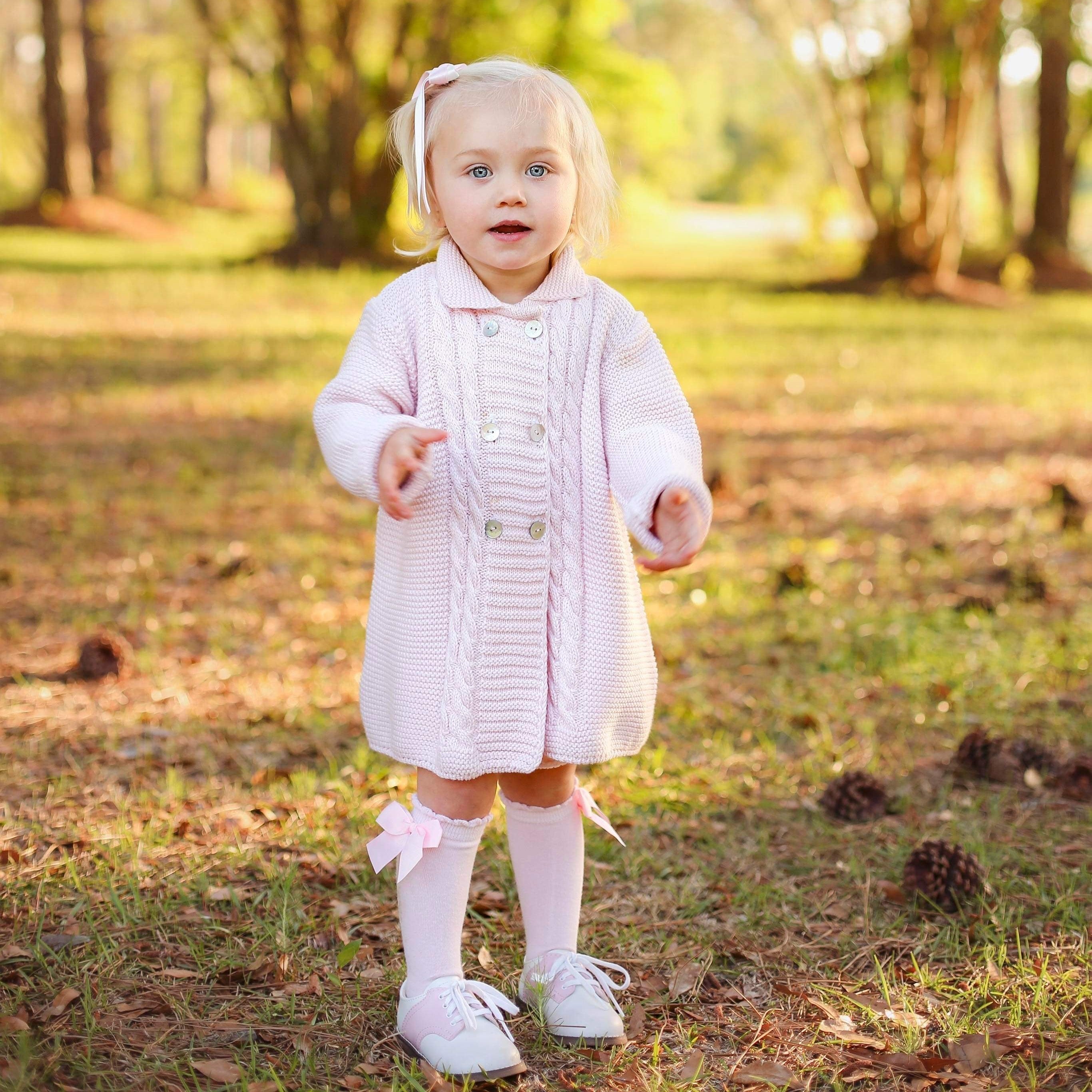 Wrap your little one in timeless elegance with this beautifully knit coat. Crafted in a soft pink, it features intricate cable detailing along the front and a classic collar for a refined, vintage-inspired look. The double-breasted button design adds both style and practicality, making it easy to layer on chilly days. Cozy, comfortable, and irresistibly sweet, this knit coat is the perfect finishing touch for keeping your little one warm in effortless charm.