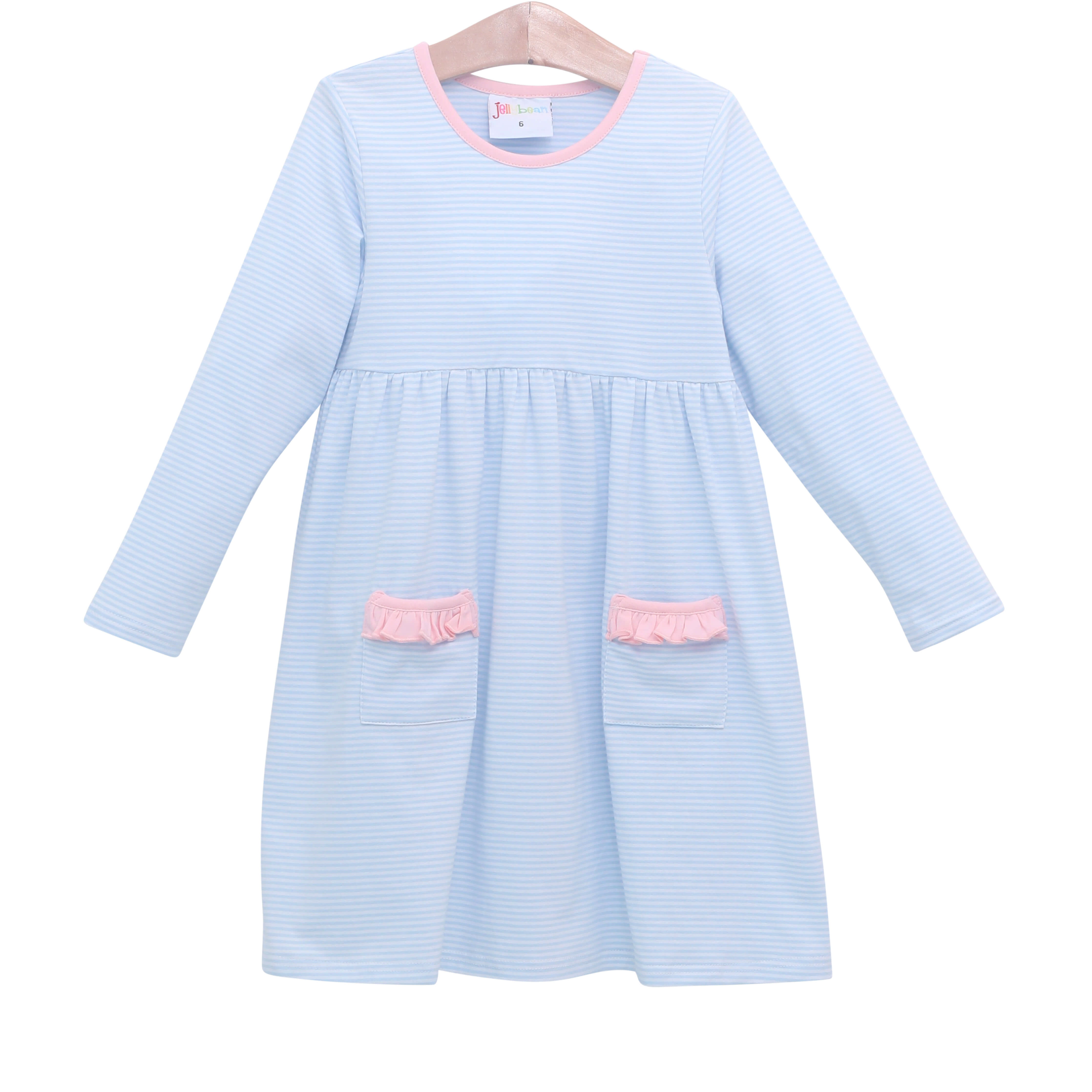 Pocket Dress- Light Blue Stripe & Pink Trim