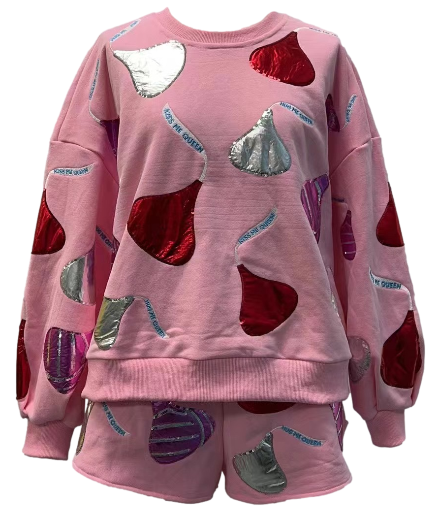 Get ready to spread the love this Valentine's Day with the Light Pink Queen of Kisses Sweatshirt. This oversized sweatshirt features a unique metallic kiss candy design, perfect for the holiday season.