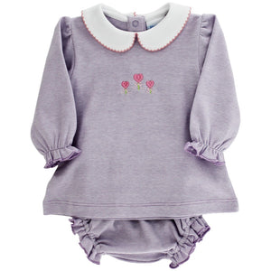 The Heart Trio Bloomer Set is an irresistibly sweet two-piece outfit designed for both comfort and charm. Featuring a soft lavender textured top with long sleeves, delicate ruffle cuffs, and a classic white Peter Pan collar, it’s adorned with three heart-shaped embroidered tulips for a whimsical touch. The matching bloomers include gentle elastic at the waist and leg openings, finished with soft ruffles for an adorable fit. Perfect for playdates, special occasions, or everyday wear, this set combines timeless style with baby-friendly comfort, making it a delightful addition to your little one’s wardrobe.