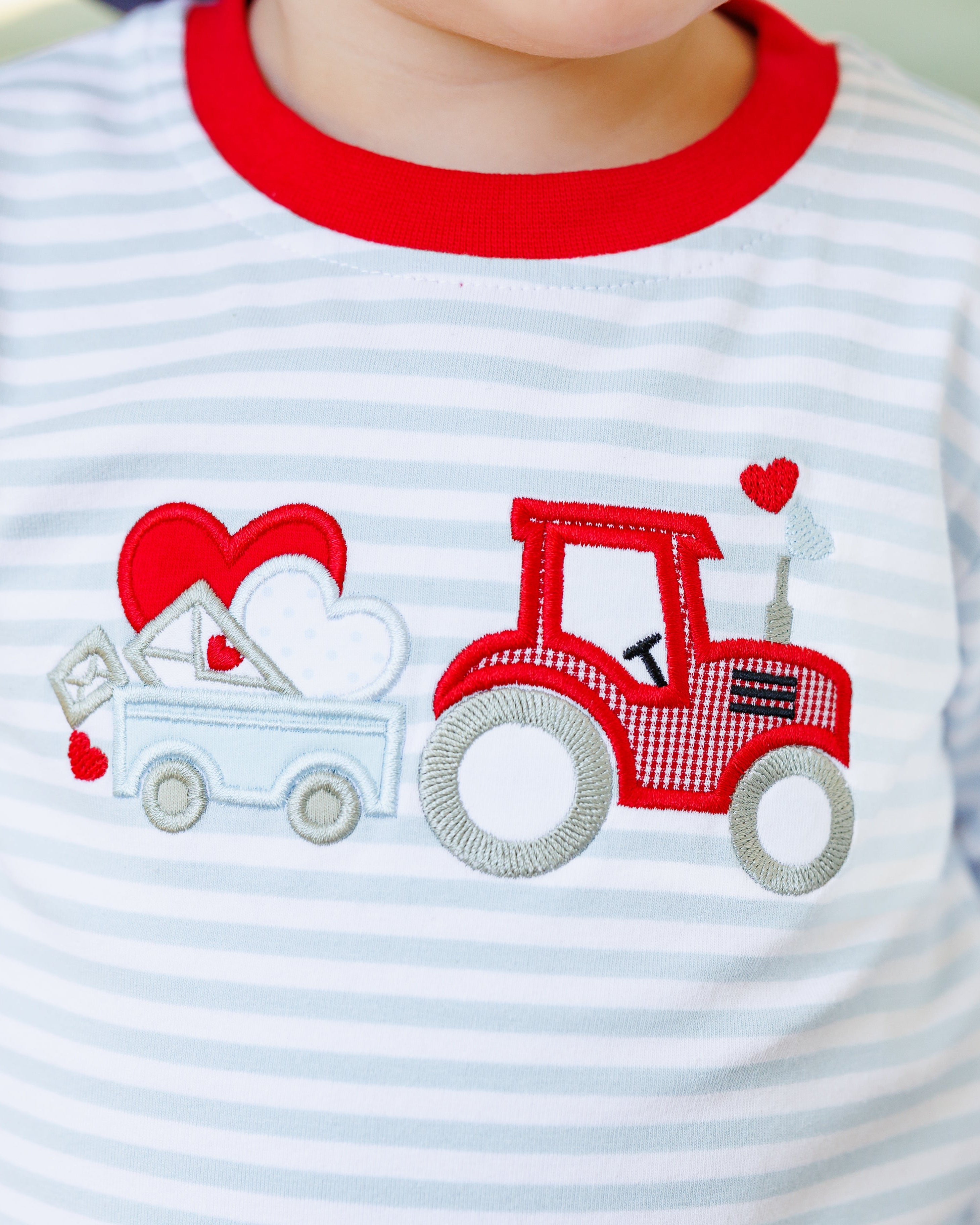 - Featuring a tractor applique hauling hearts and love letters