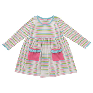 Stay chic and playful with the Multi Stripe LS Dress! This dress boasts long sleeves and a fun and vibrant multi stripe pattern. The blue pockets, accented with charming pink ruffles, add a touch of whimsy to this already charming piece. Perfect for any occasion, this dress will be sure to turn heads and keep you looking trendy and stylish.