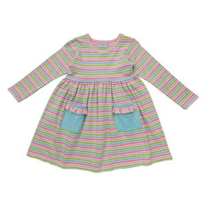 Stay chic and playful with the Multi Stripe LS Dress! This dress boasts long sleeves and a fun and vibrant multi stripe pattern. The pink pockets, accented with charming blue ruffles, add a touch of whimsy to this already charming piece. Perfect for any occasion, this dress will be sure to turn heads and keep you looking trendy and stylish.