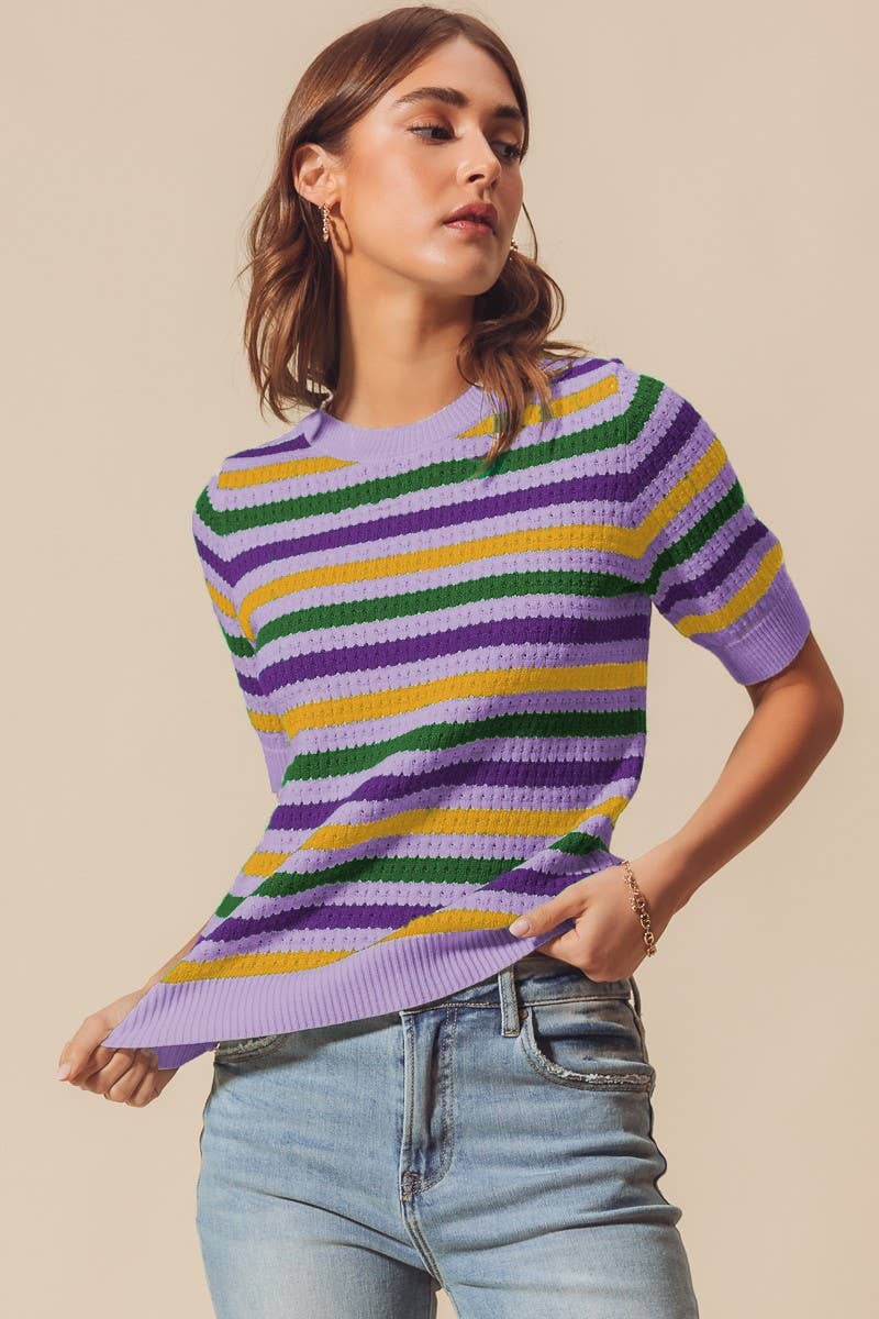Mardi Gras Crew Neck Stripe Sweater Top- Lavender