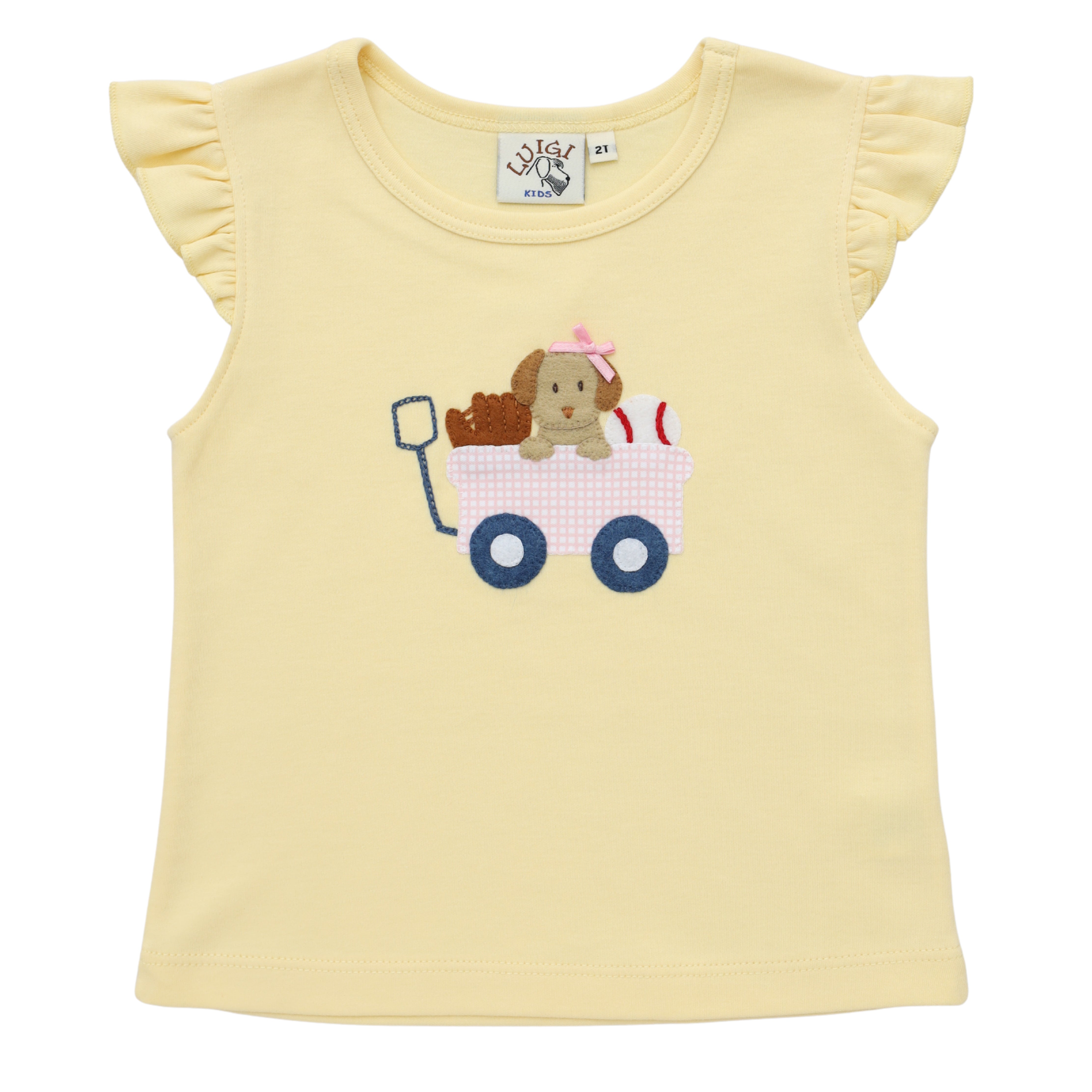The Ballpark Buddy Wagon Blouse will have her rolling into playtime with puppy love, baseball fun, and endless smiles.