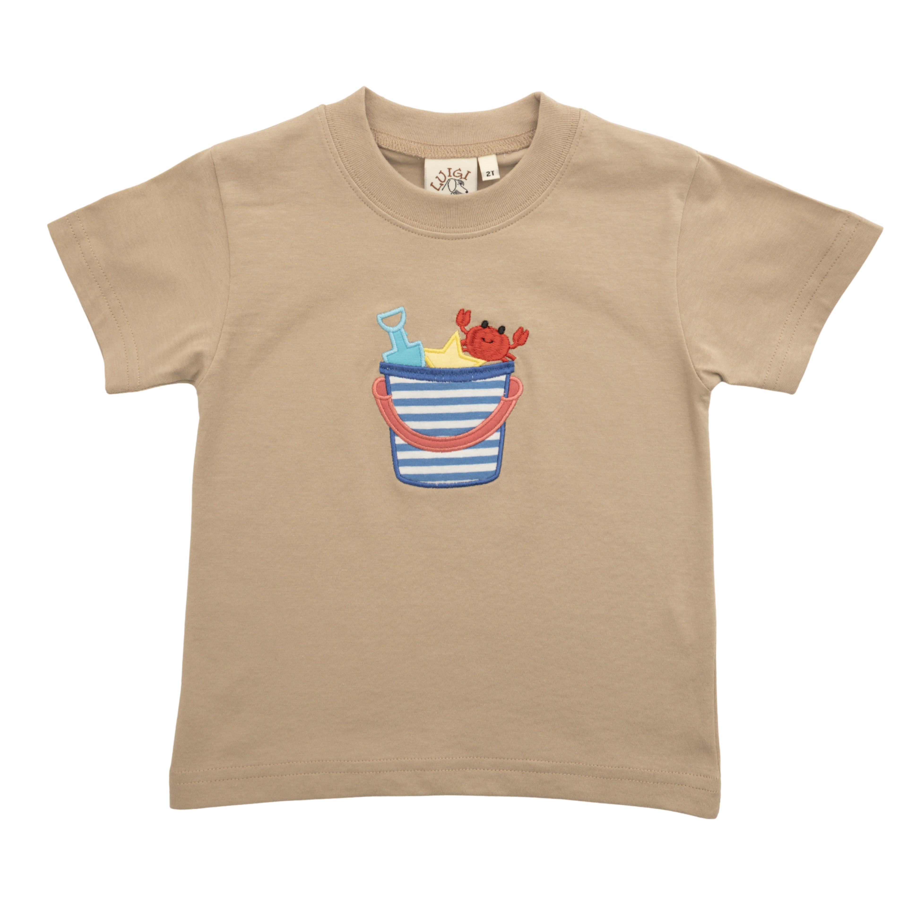 - Applique striped bucket with a crab, a star and a sand shovel