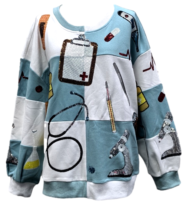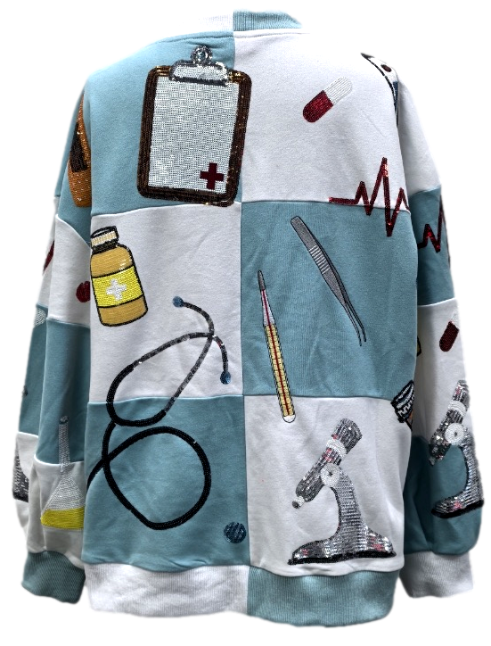 Queen of Sparkles- Light Blue & White Checkered Medical Instrument Icon Sweatshirt- Light Blue