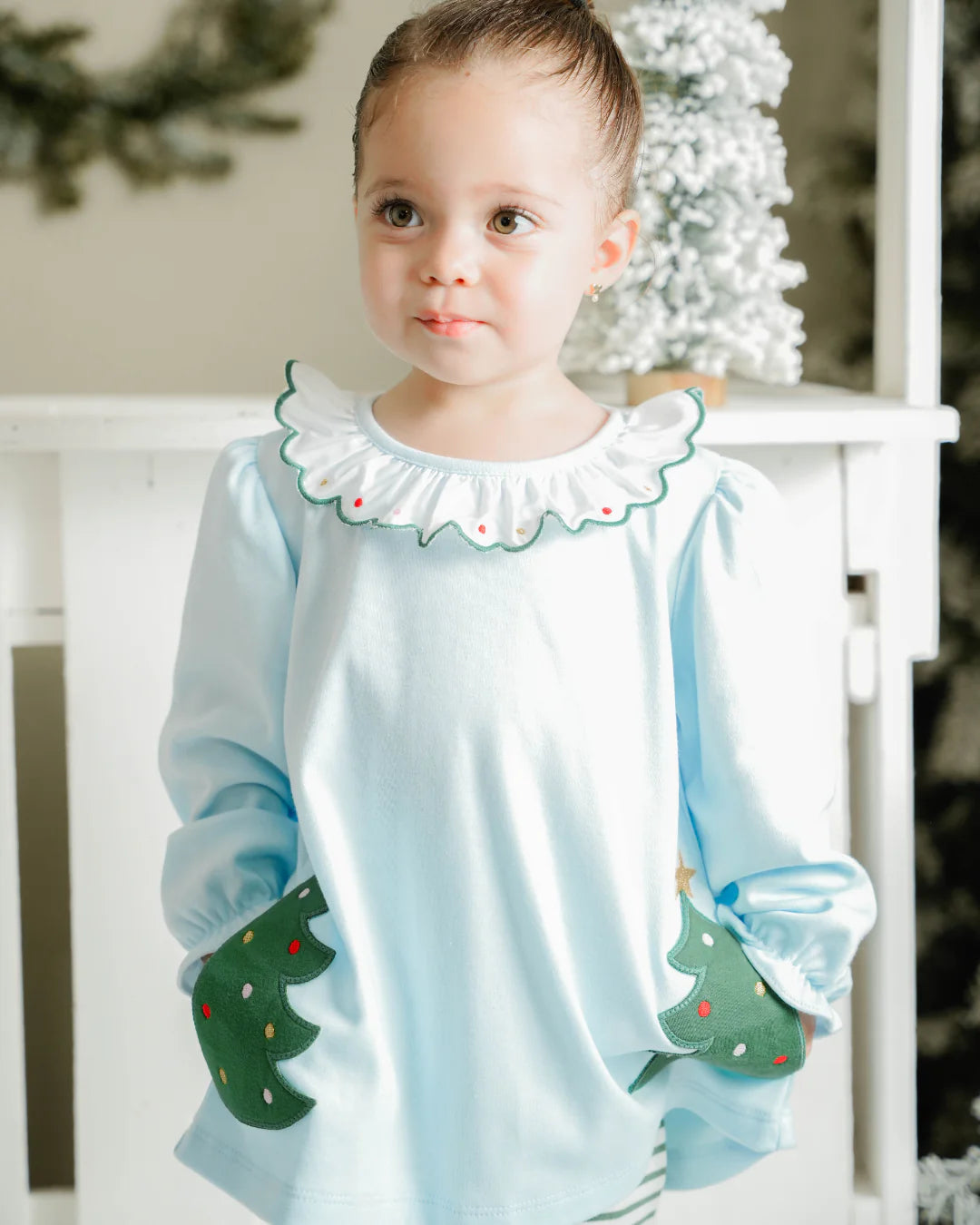 A sweet winter look for your little girl! This light blue knit top with a festive Christmas tree appliqué pairs perfectly with Christmas green thin stripe leggings — made for twirls, giggles, and holiday cookie fun!