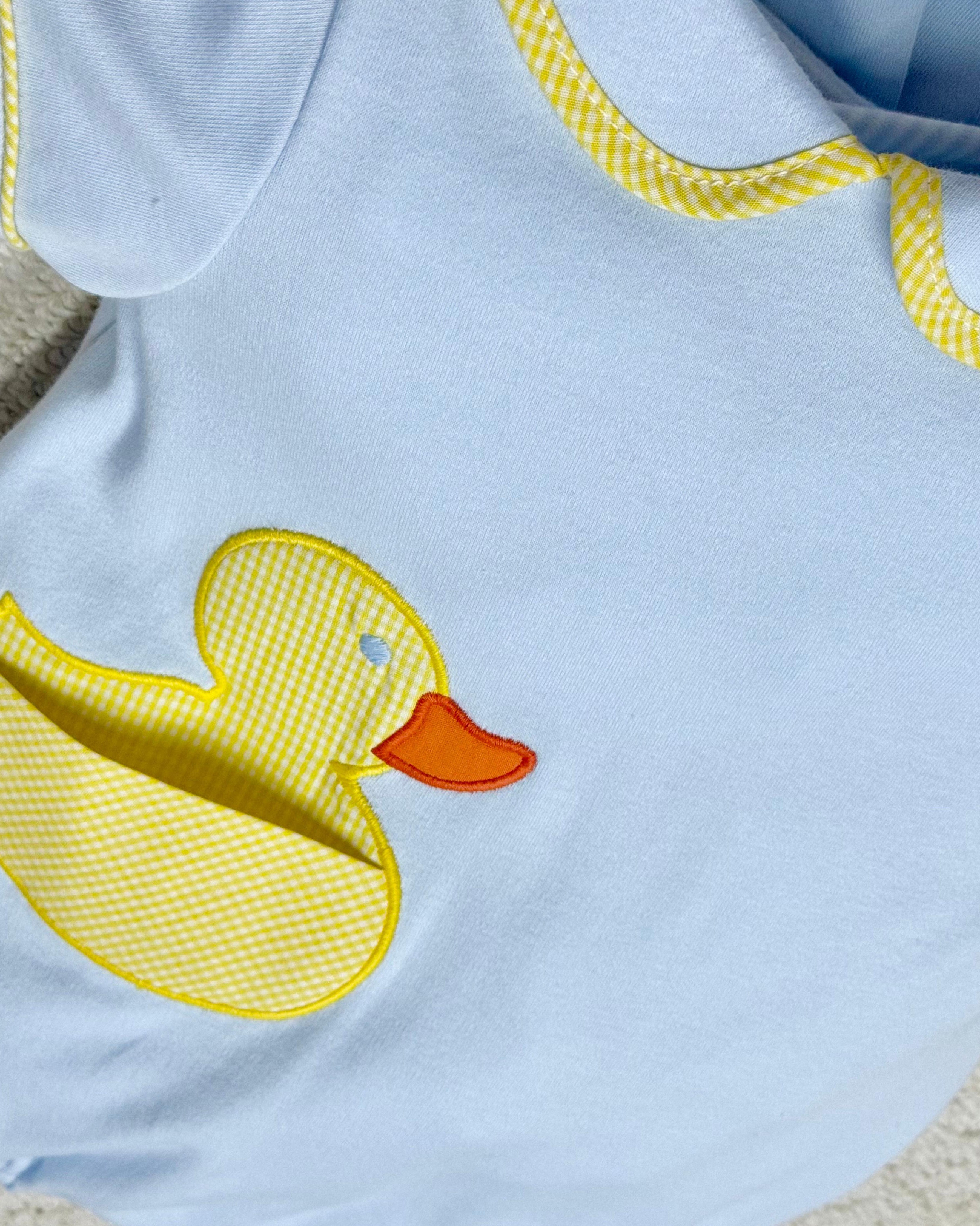 The Duckies Peter Bubble is a timeless piece with a playful duck applique. Made from soft light blue knit fabric, it provides a comfortable fit and easy movement. The light blue color keeps this bubble looking sweet and classic.