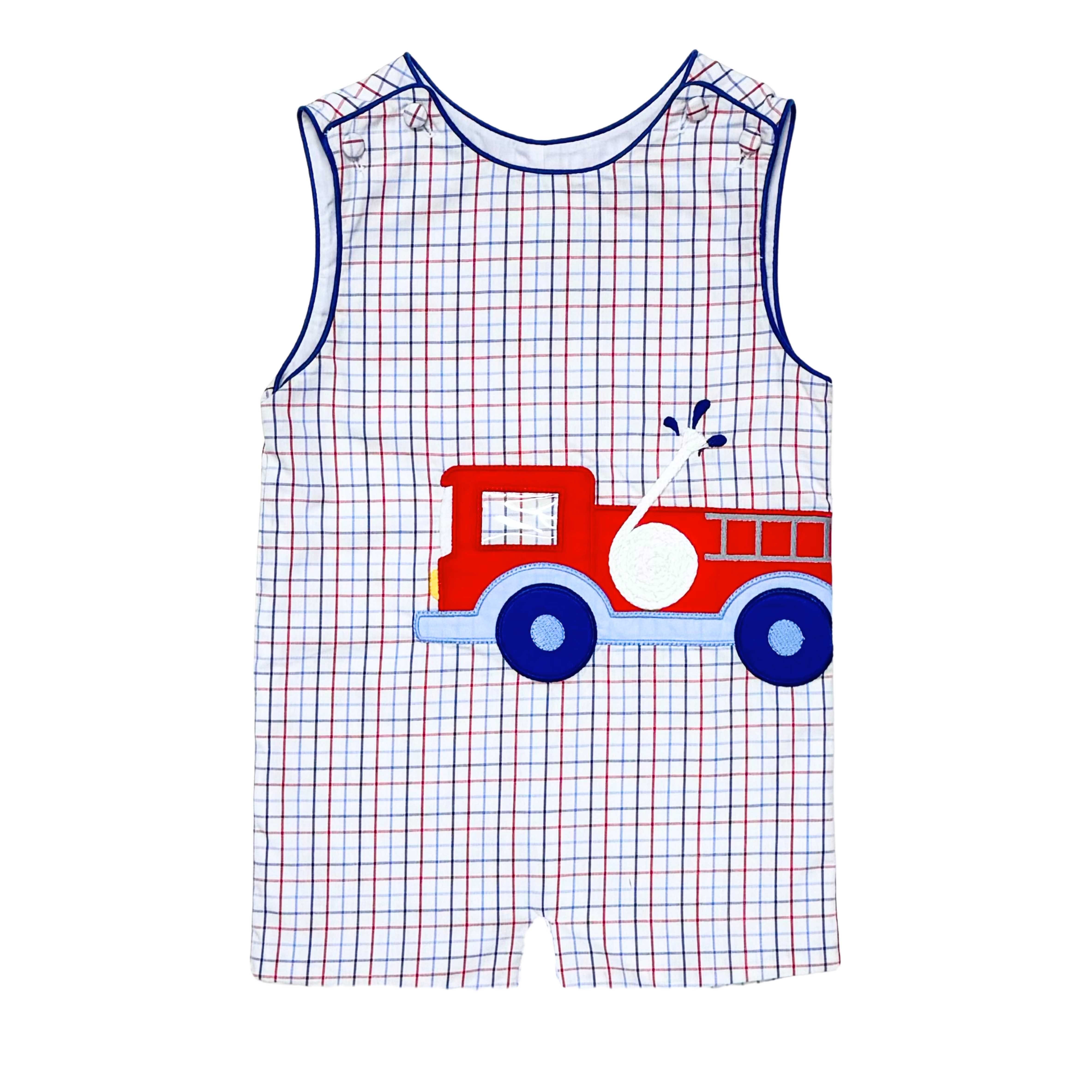 The Firetruck Ashton Shortall is a festive and fun design featuring a bold firetruck applique. Crafted from star spangled windowpane fabric, this shortall showcases a patriotic red, white, and blue color palette. Perfect for summer events and everyday adventures.