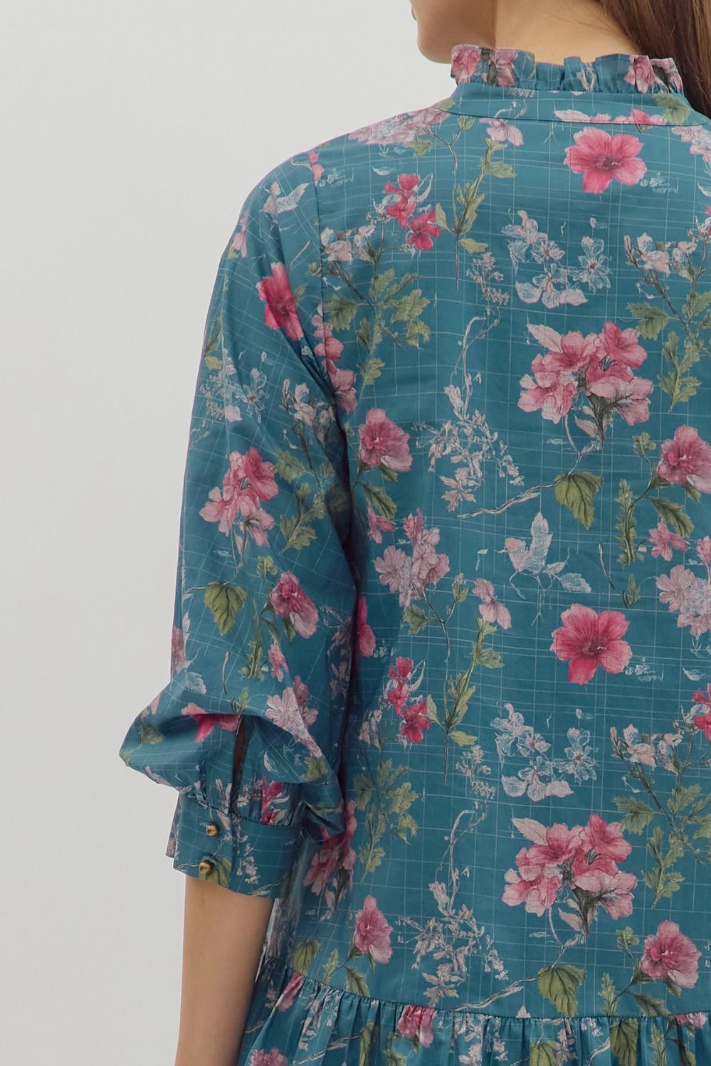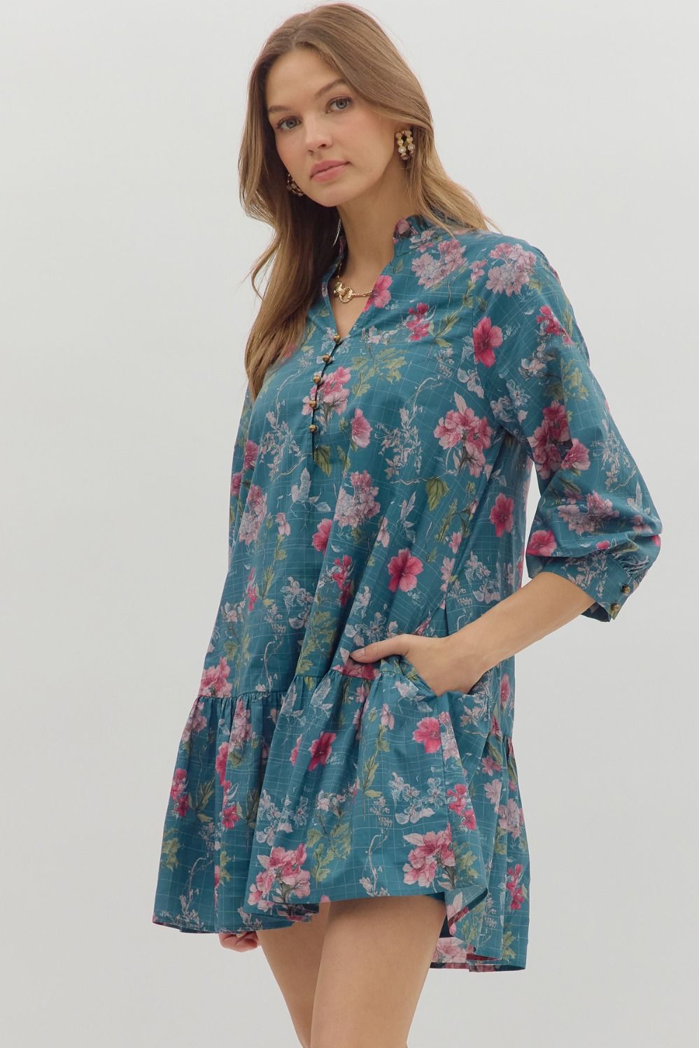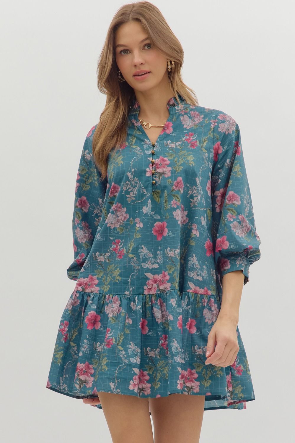 Floral Ruffle Cuff Band ¾ Sleeve Dress- Teal