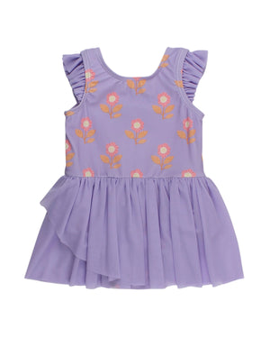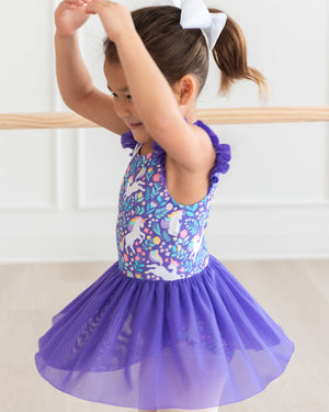 This Flutter Sleeve Leotard in the charming Bubblegum Pink- Butterfly Garden Toile print brings a playful touch to any dance or dress-up day. Its flutter sleeves add a whimsical flair, while the vibrant floral pattern keeps things bright and fun. Perfect for twirling, stretching, or simply shining with style!