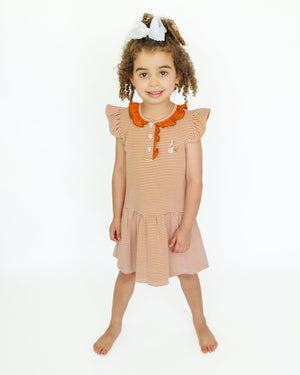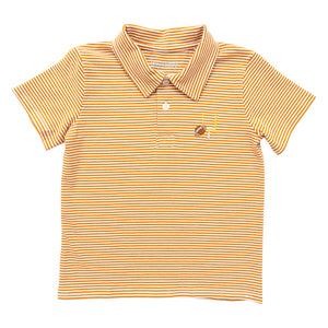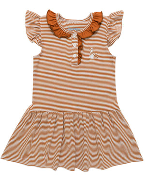 Get ready for game day with this playful polo romper featuring burnt orange stripes and a fun embroidered football detail. Perfect for cheering on the team in style and comfort!