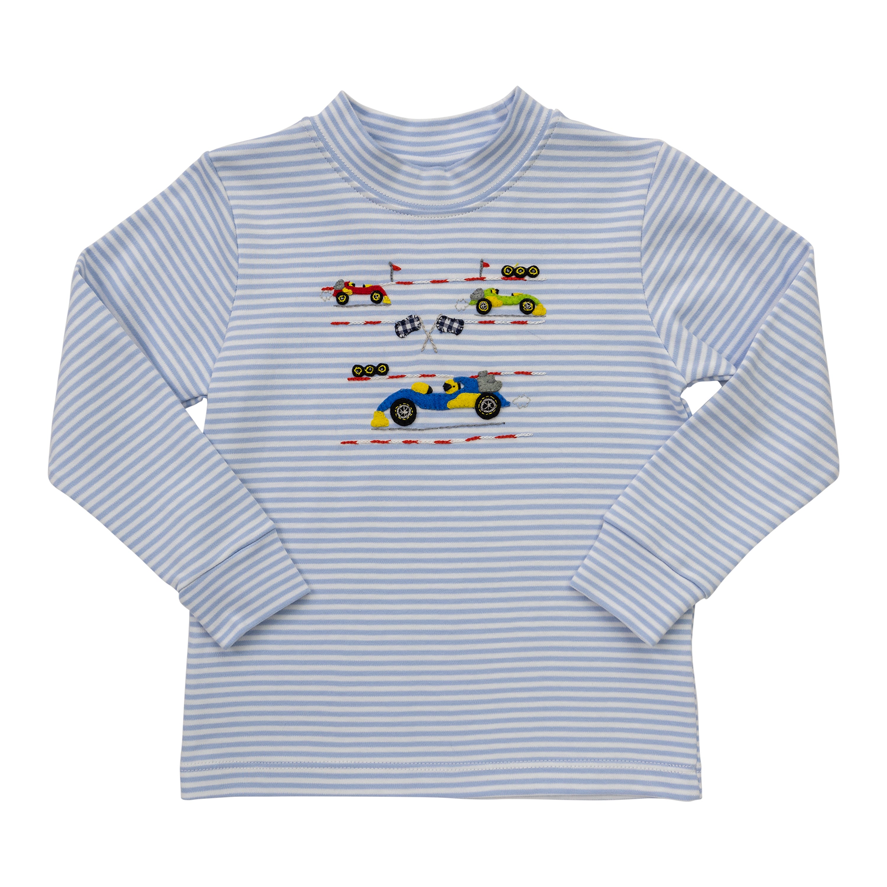 The Grand Prix Shirt will have you racing towards style and comfort. With a classic crew neck and long sleeve design, it's perfect for any season. The light blue and white stripes add a playful touch, making you the center of attention. Go ahead, make like a race car and zoom!