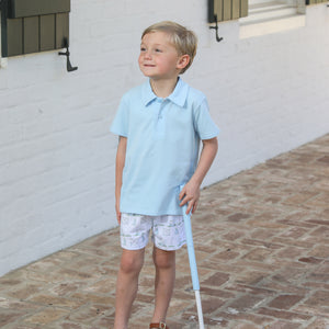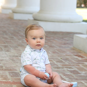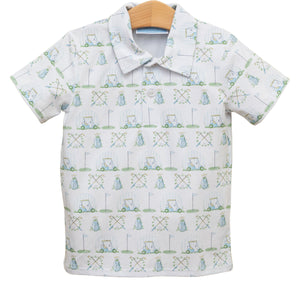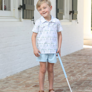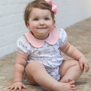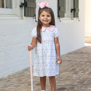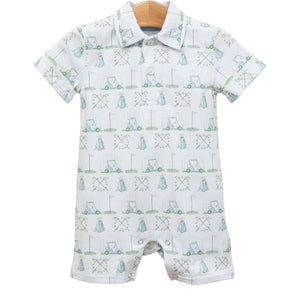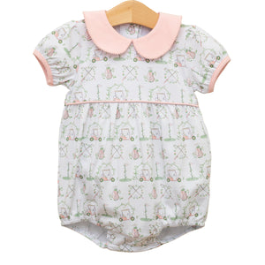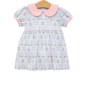 Get ready to score style points with the Hole in One Bloomer Set. This adorable set features a playful Hole in One print, complemented by a light pink peter pan collar, trim, and bloomers. Perfect for little girls who want to stand out on and off the course!